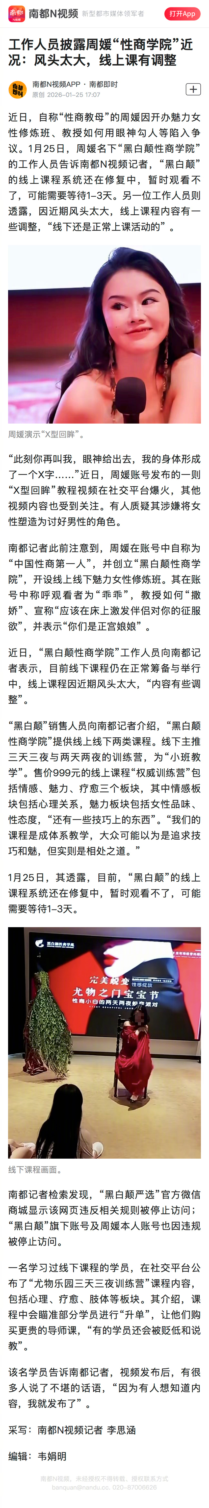 #性商学院线上课因风头太大多处下线#【工作人员披露周媛“性商学院”近况:风头太大,线上课有调整】#性商学院线下课仍在举行##起底性商教母周媛#近日,自称“性商教母”的周媛因开办魅力女性修炼班、教授如何用眼神勾人等陷入争议。1月25日,周媛名下“黑白颠性商学院”的工作人员告诉南都N视频记者,“黑白颠”的线上课程系统还在修复中,暂时观看不了,可能需要等待1-3天。另一位工作人员则透露,因近期风头太大,线上课程内容有一些调整,“线下还是正常上课活动的” 。“此刻你再叫我,眼神给出去,我的身体形成了一个X字……”近日,周媛账号发布的一则“X型回眸”教程视频在社交平台爆火,其他视频内容也受到关注。有人质疑其涉嫌将女性塑造为讨好男性的角色。南都记者此前注意到,周媛在账号中自称为“中国性商第一人”,并创立“黑白颠性商学院”,开设线上线下魅力女性修炼班。其在账号中称呼观看者为“乖乖”,教授如何“撒娇”、宣称“应该在床上激发伴侣对你的征服欲”,并表示“你们是正宫娘娘” 。南都N视频记者 李思涵