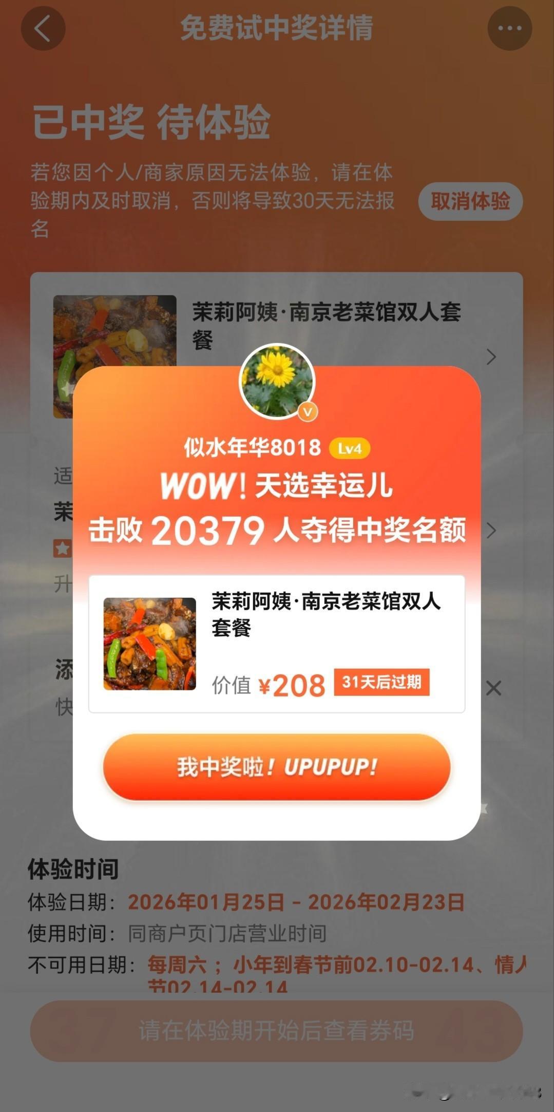 在大众点评抽中一个免费双人套餐,中午不想在家里烧饭,和老伴两个人去吃个霸王餐。 坐车来到秦淮区集庆门附近的茉莉阿姨.南京老菜馆,向店员出示了中奖券码,等待上菜期间,服务员热情地送上一份沙糖桔。双人套餐有:牛筋骨耗儿粉(牛筋骨耗儿粉和茉莉姜辣鸭二选一)、老南京下饭菜(青椒毛豆干子肉丝)(老南京下饭菜与湖南小炒肉二选一)、清炒油麦菜、扬州炸臭干、江南点心2份、米饭2份。在大众点评打卡收藏送冰糖雪梨饮料一盒。 两人吃这个套餐份量足够,土菜馆的口味。吃完坐车去老门东逛一逛,回去还得在大众点评上写100字以上的试吃评价。