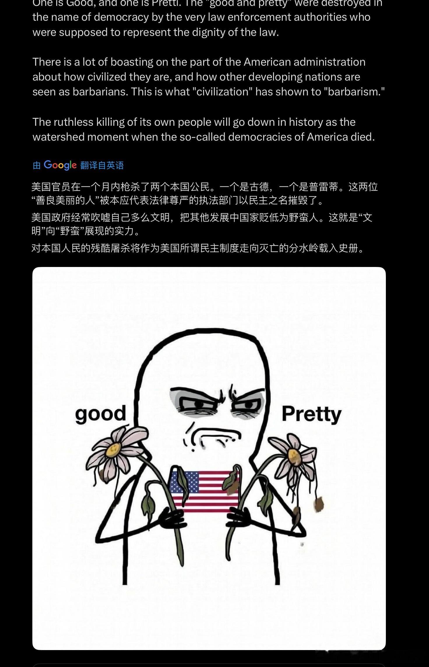 有时候真觉得冥冥之中自有天意。美国政府枪杀的两位公民一个姓Good(善),一个姓Pretti(美)。“真善美”已经失去了两个,“真”又如何能独存。如今的美国指鹿为马,侵略他国残害平民,又如何能担得起曾经自诩的,引导世界的“真善美”灯塔之名呢?他日史书记载,这看似不起眼的事件或将成为改变历史的风暴。