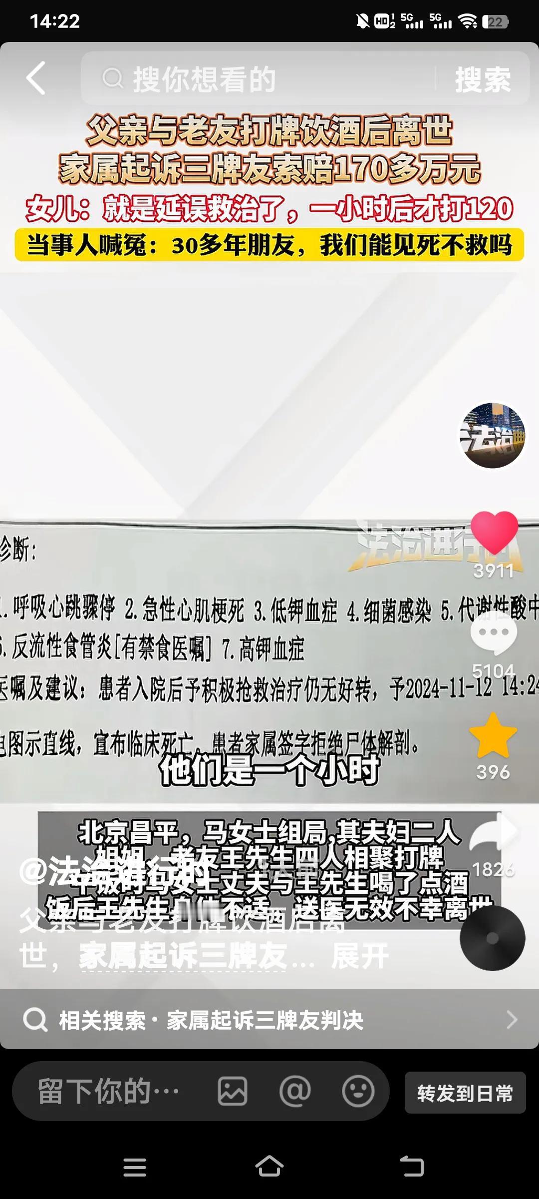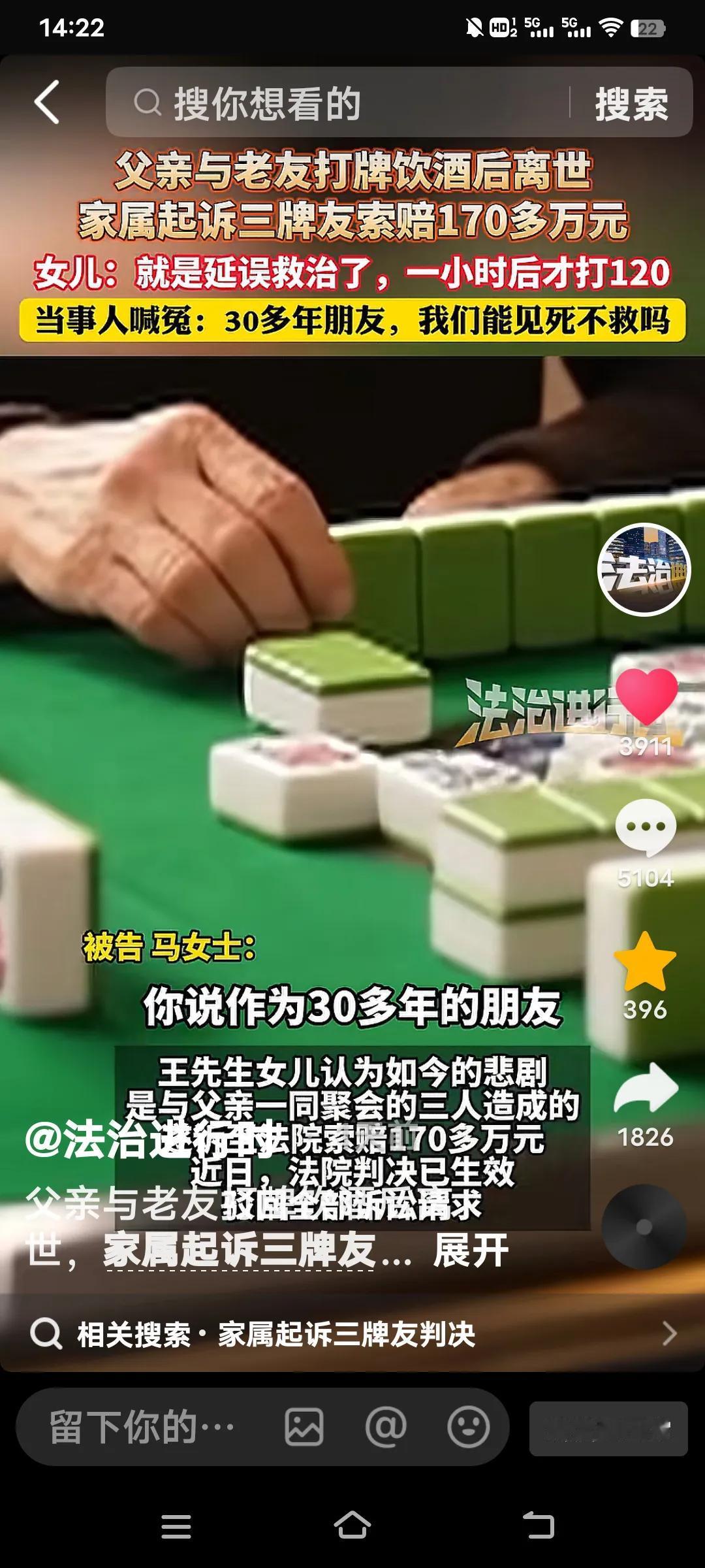 父亲与老友打牌饮酒后不幸离世,家属将三名牌友告上法庭,索赔170多万,此事引发了极大争议。站在家属的立场,亲人骤然离世,他们想找个责任承担者,这也在情理之中。但从牌友的角度看,老友相聚打牌喝酒本是乐事一桩,谁能想到会发生这样的悲剧呢? 170多万可不是一笔小数目,死者女儿认为是牌友延迟救治,一个多小时后才拨打120。被告牌友马女士悲痛哭诉:“我们怎会见死不救?我们可是30多年的老友了。”医嘱建议病人住院,可病情仍无好转,于2024年1月12日宣布死亡,然而家属签字拒绝尸检。近日,法院判决生效,驳回了家属的全部诉讼请求。法律才是最好的保护武器! 这起事件给大家敲响了警钟,朋友聚会喝酒还是要适度。类似的情况已不止一次发生。有网友评论:“不能见死不救,但家属就是想钱。况且法院都不判赔偿,要是没拿到钱,多丢脸。”而且诊断结果显示多种病情都很严重,如急性心梗堵塞等。死因确实与牌友无关。 喝酒死亡赔偿 拼酒致死赔偿 广西打麻将命案 打牌意外死亡 牌友一路走好