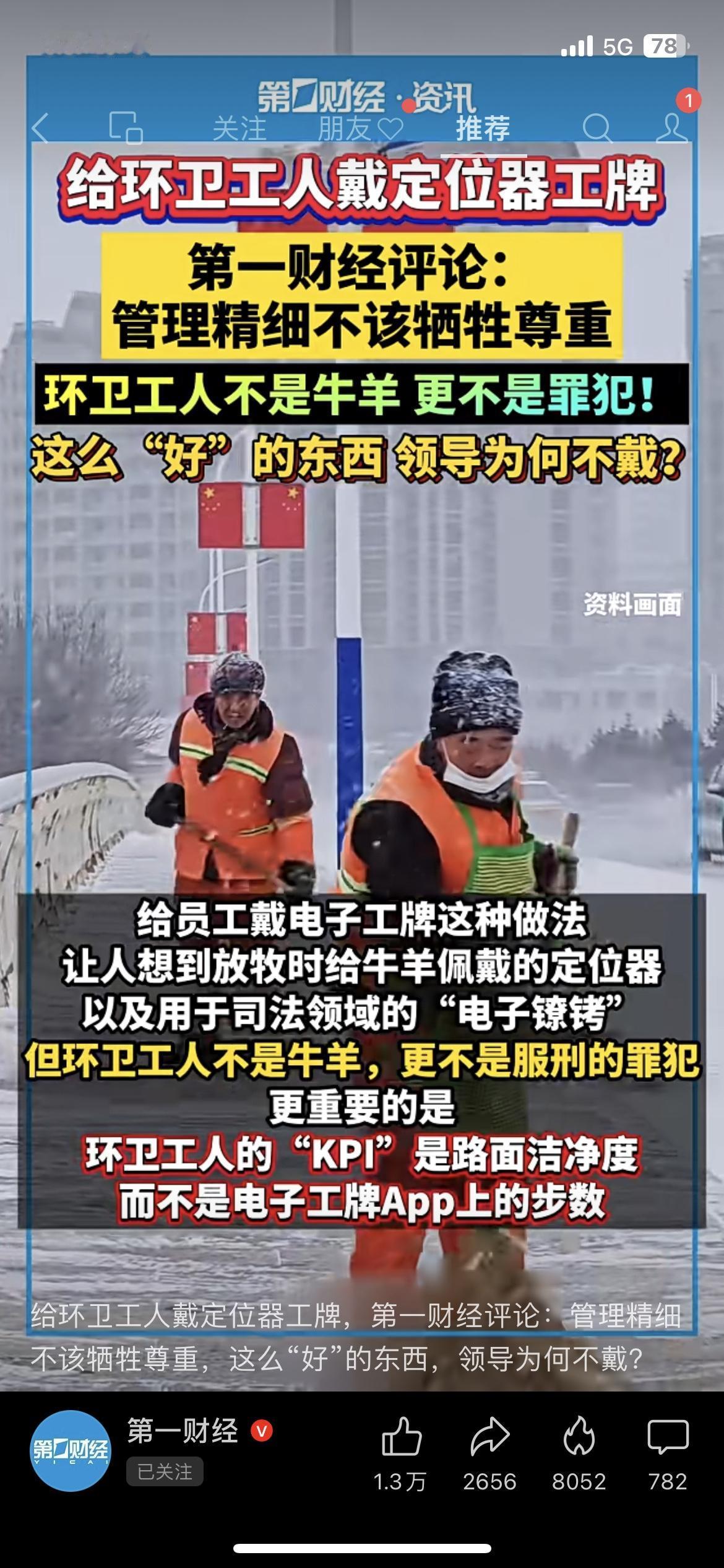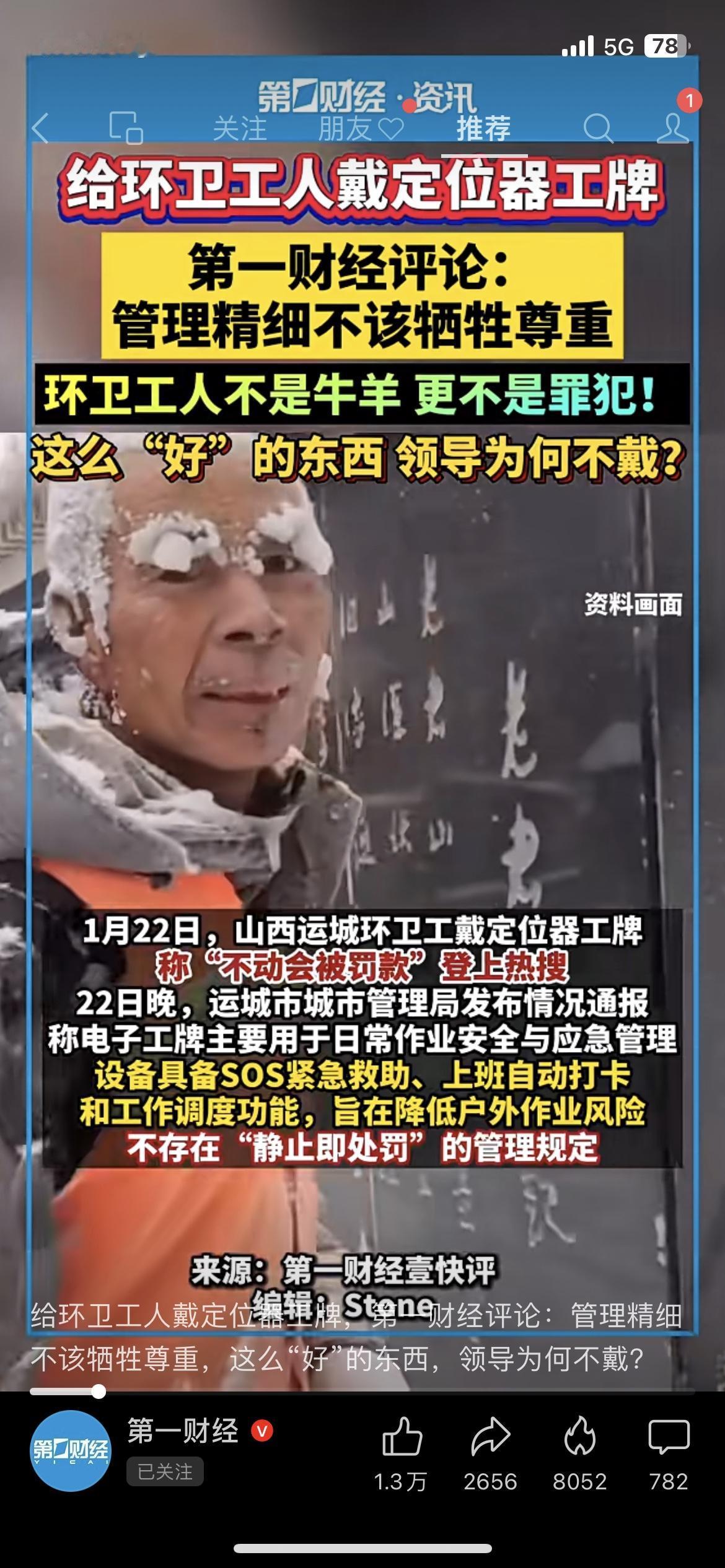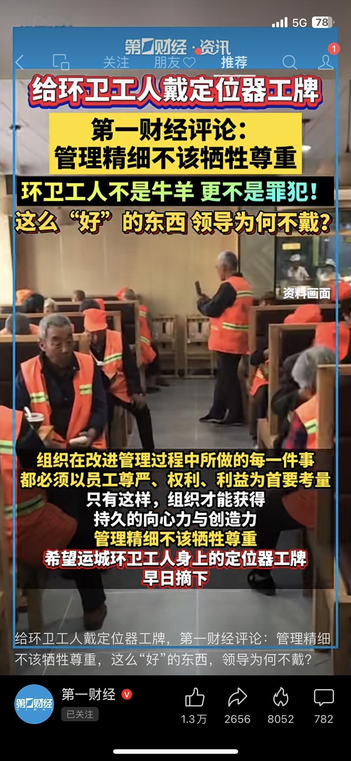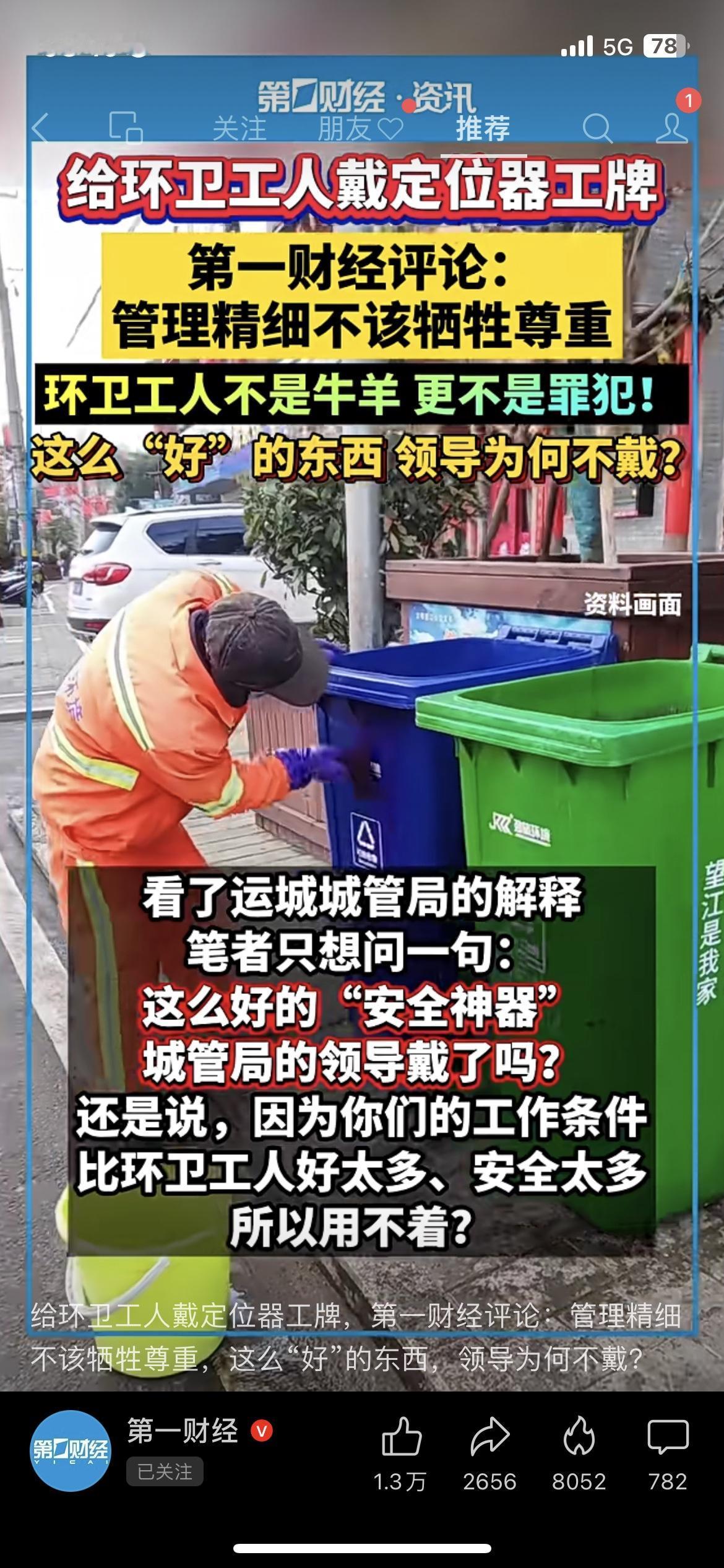 给环卫工人戴定位器工牌,到底是管理还是侵犯? 山西运城环卫工戴的电子工牌被质疑像“电子镣铐”,官方回应是用于安全管理,但网友怒了:“这么好的东西,领导怎么不戴?”管理精细化没错,但不该以牺牲尊严为代价,环卫工人不是牛羊,更不是罪犯!你觉得这种定位工牌该取消吗? 环卫工人 民生热点 管理争议
