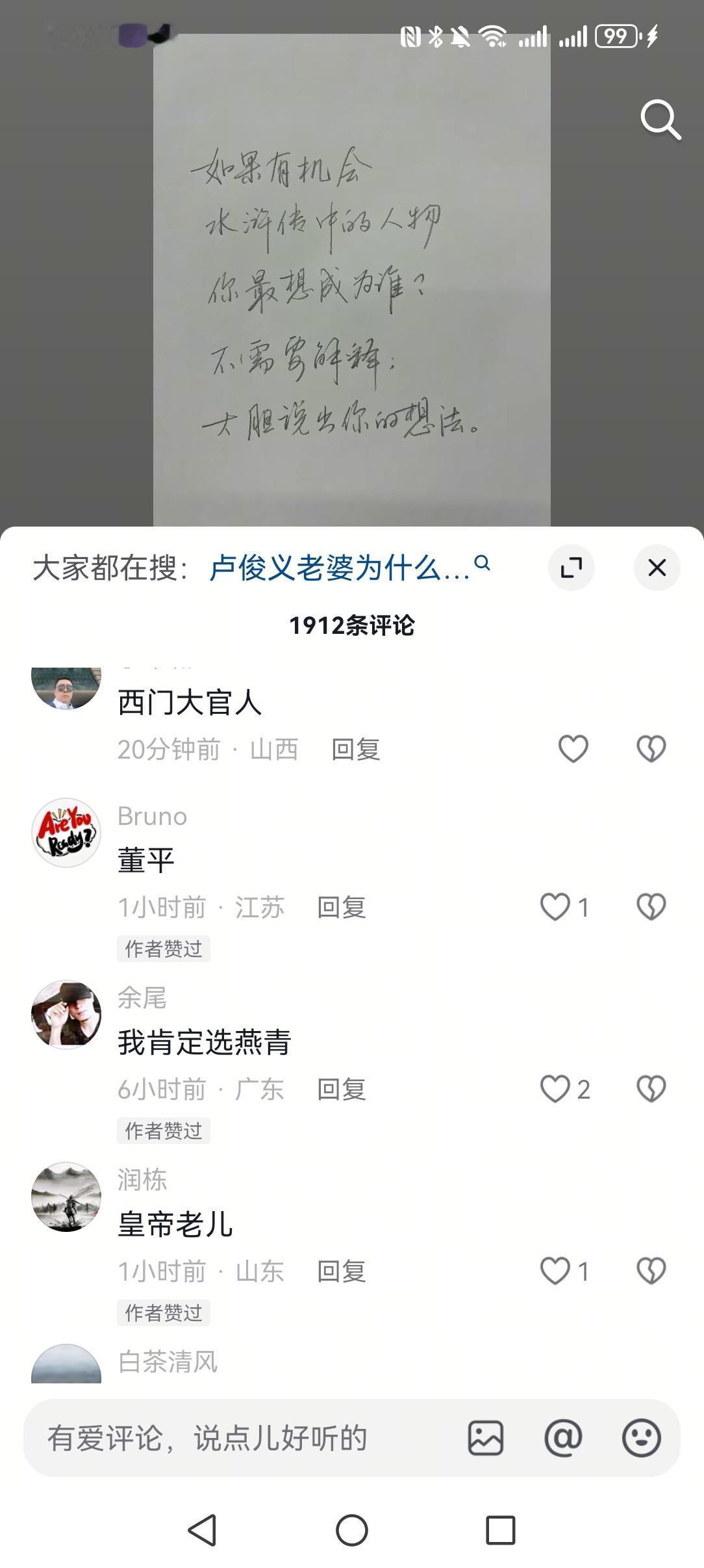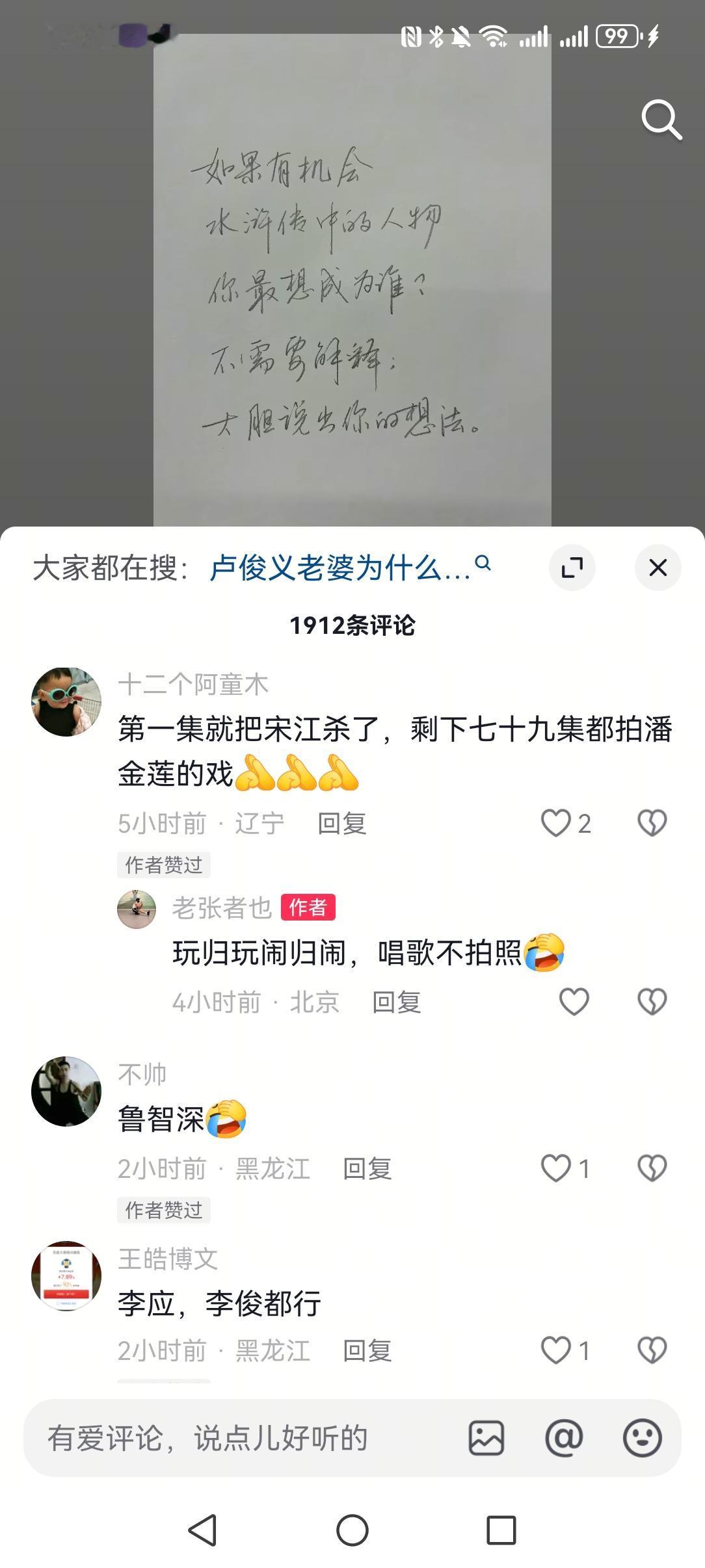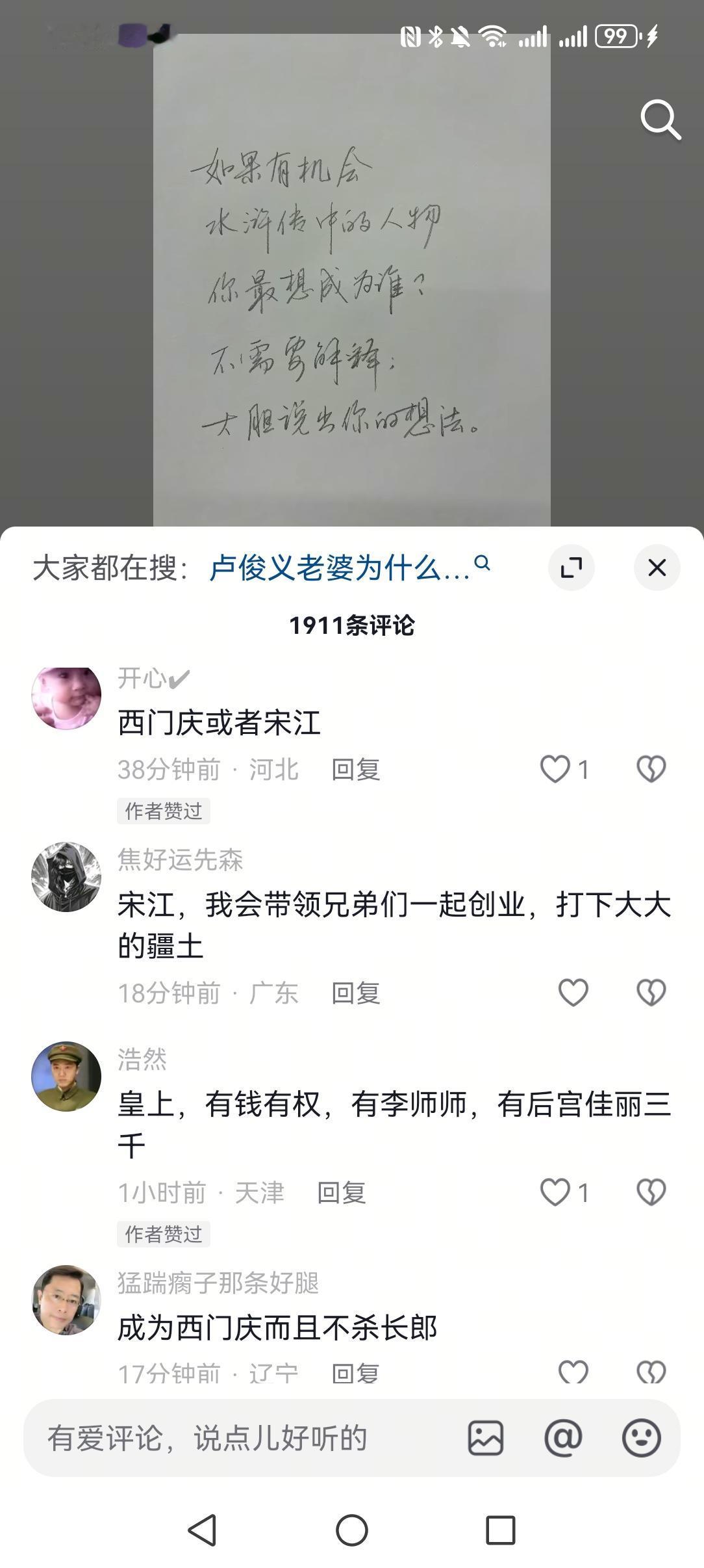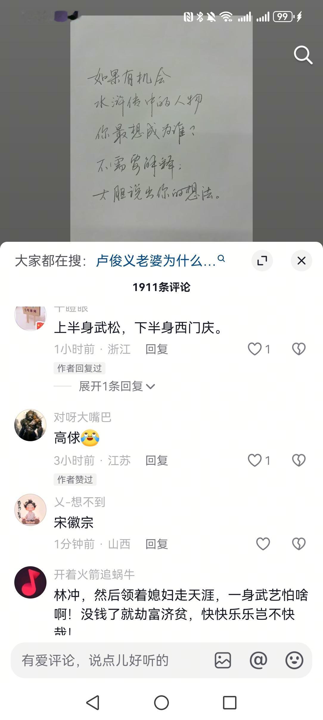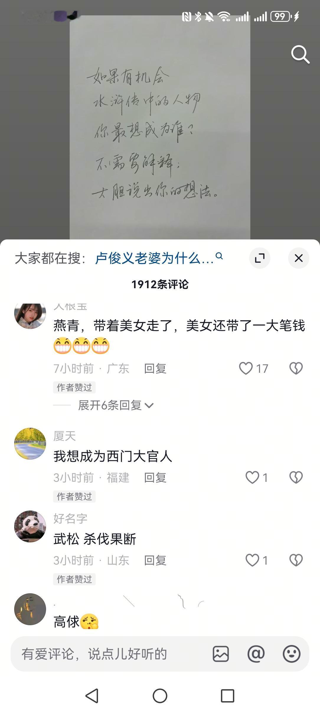 刷到一个抖音视频,博主问假如能够成为水浒传的一个人物,你最希望成为谁。 小编以为武松、林冲、鲁智深这些有勇有谋、义薄云天的英雄人物会成为大家的首选,结果评论区令人大跌眼镜,西门庆、高俅、甚至宋徽宗的上榜率居然非常高,大家这是怎么了。[捂脸][捂脸] 不知道条友们最想成为哪个人物?