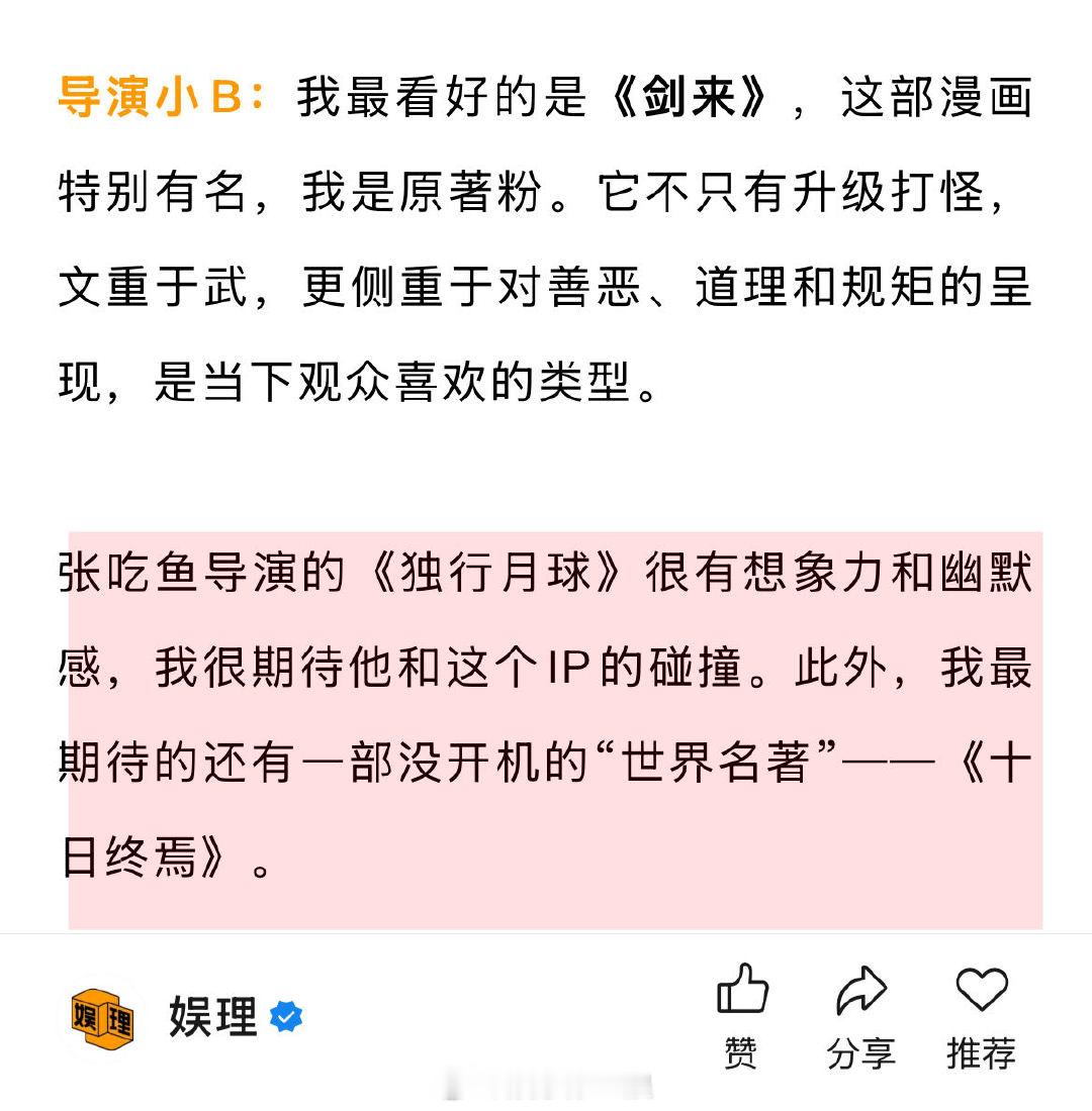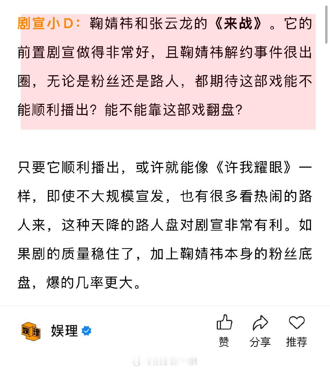 业内谈2026最看好的待播剧 肖战王鹤棣杨紫吴磊新剧被业内看好 某编辑期待的新剧是《云襄传之将进酒》,“第二部还是原班人马,质量有保证。”某剧宣则看好鞠婧祎和张云龙的《来战》,“只要它顺利播出…如果剧的质量稳住了,加上鞠婧祎本身的粉丝底盘,爆的几率更大。”娱理独家↓