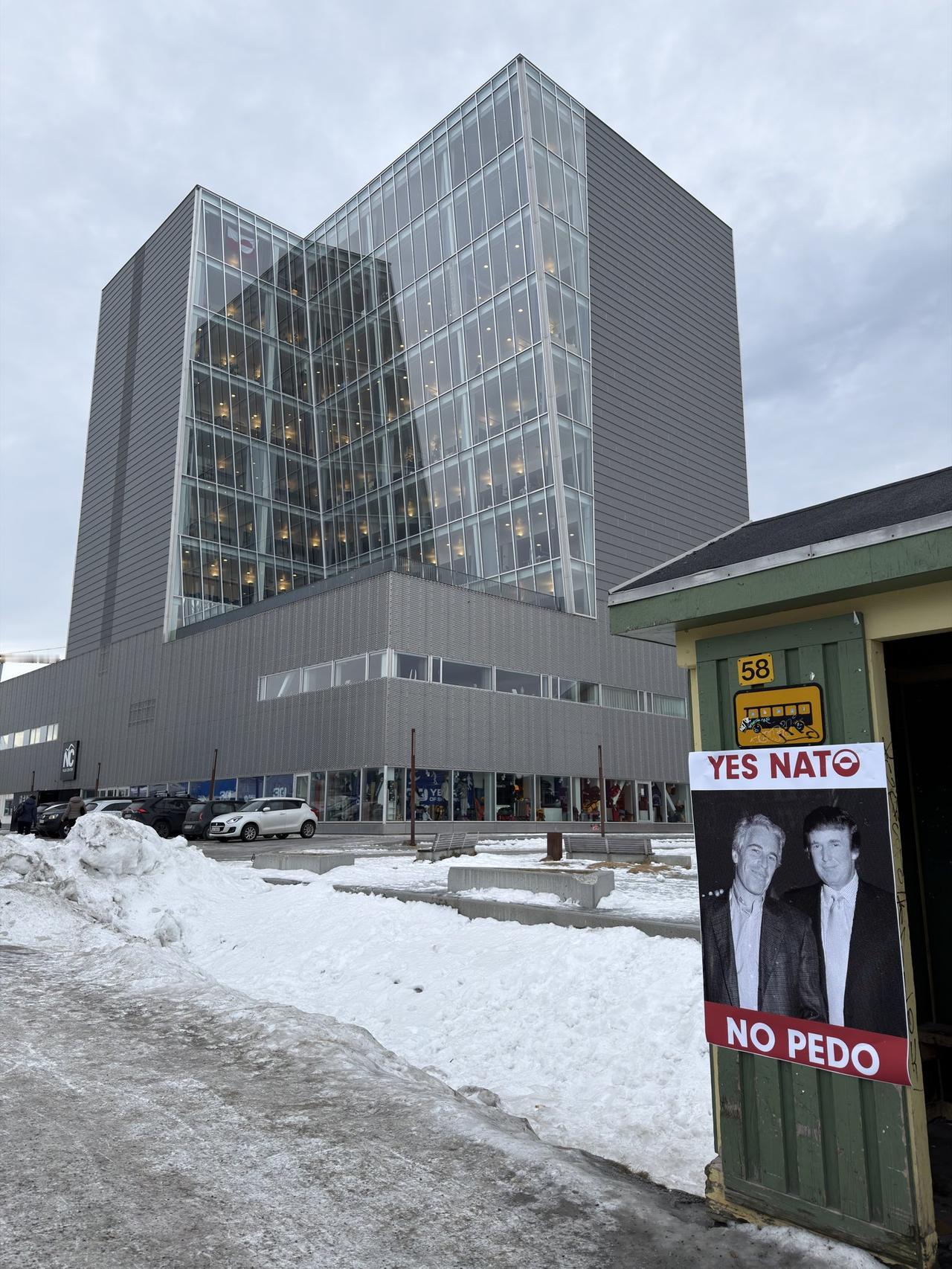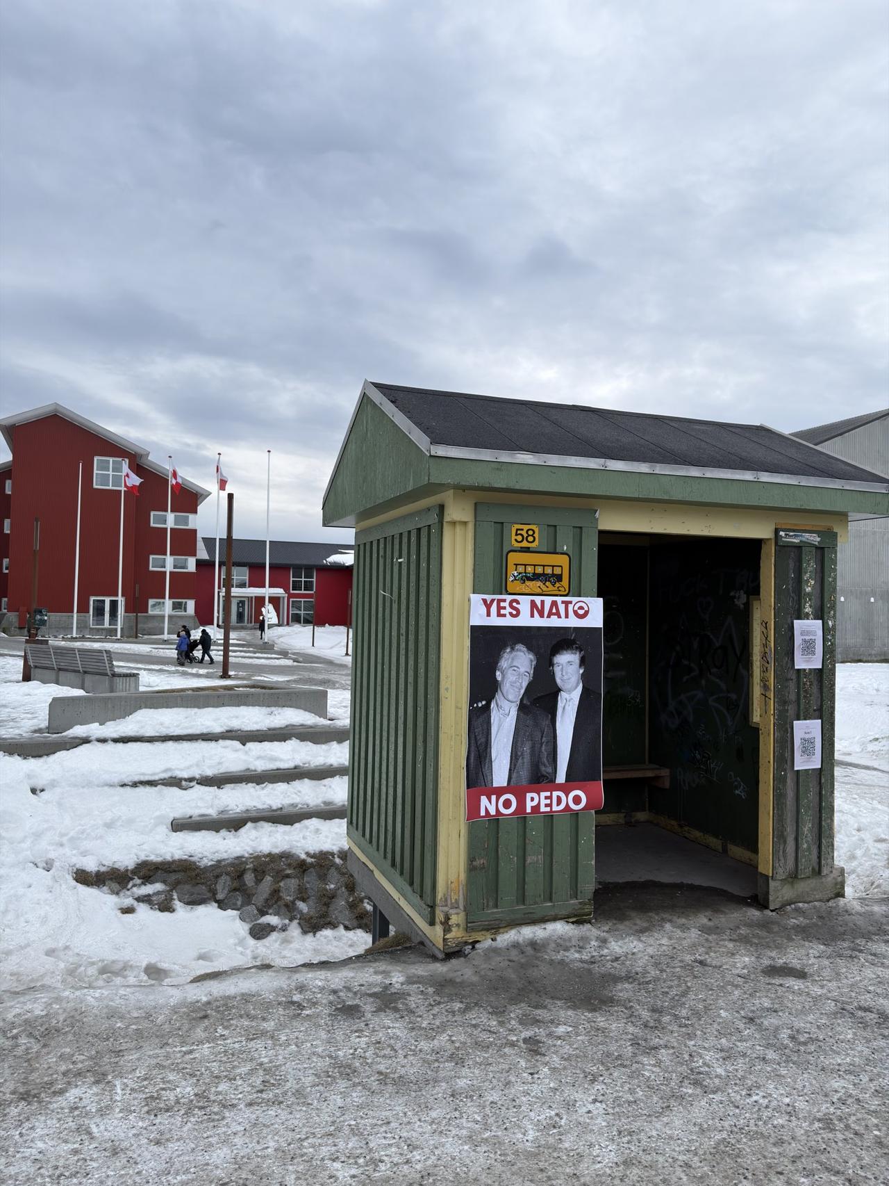 据当地消息:格陵兰岛努克市公交站出现特朗普与爱泼斯坦的合影照。