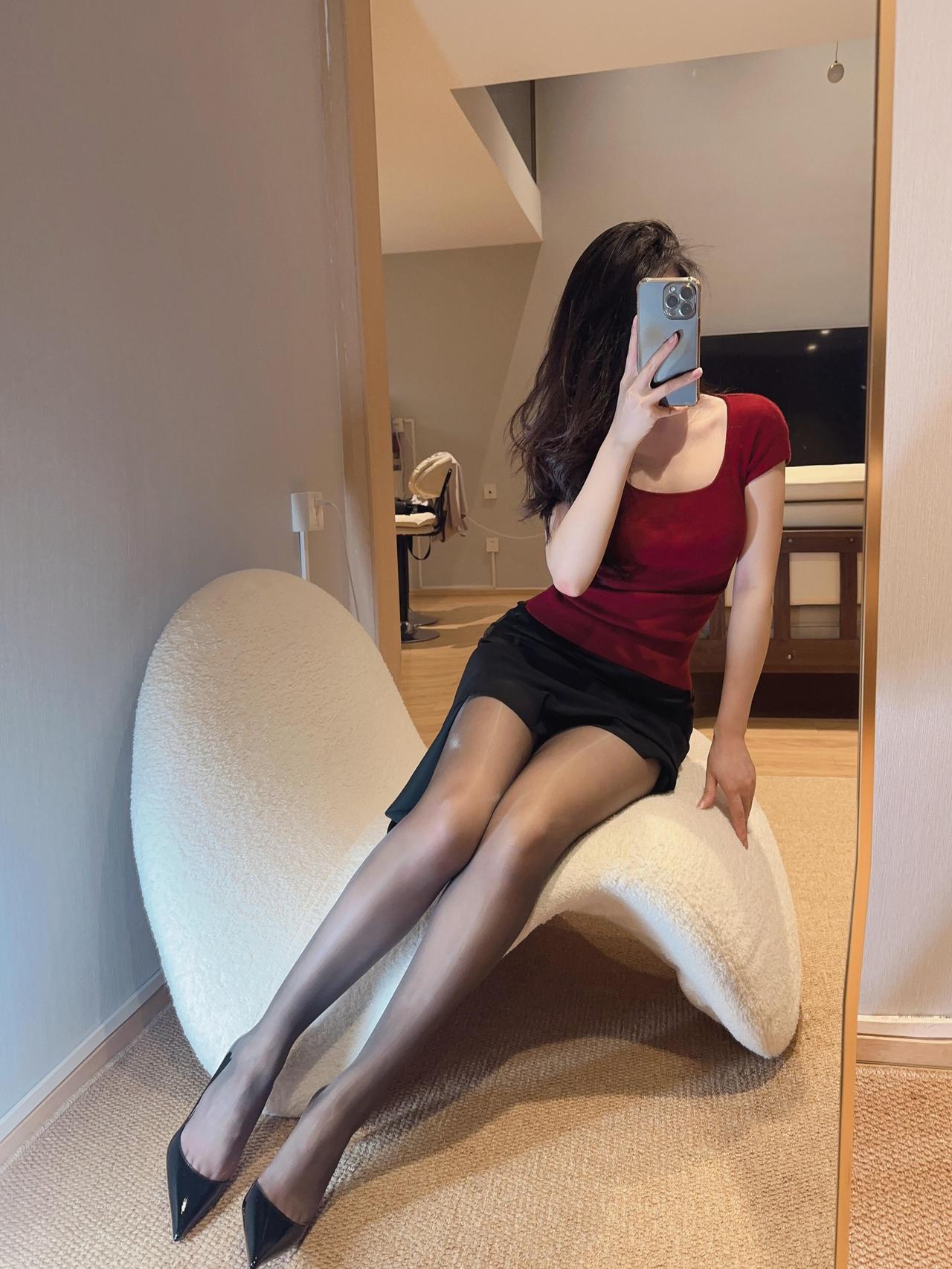 优雅自拍,红裙黑丝高跟鞋,居家时尚。