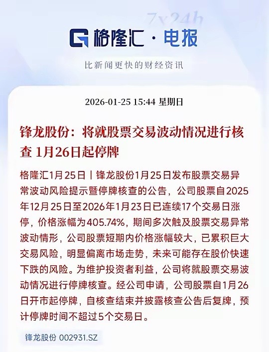 18个一字板的大牛股还是扛不住停牌了昨天锋龙股份刚刚证监会监管 ,今天就发了公告在周一主动停牌。锋龙股份一直炒的就是优必选入住,成功成为人形机器人公司,本身优必选是港股“人形机器人第一股”,所以资金疯狂的进入,连续18个一字板,直接把市盈率炒到了872,已经严重脱离了基本面。这都不是村里要打压的问题了,完全就是往灭亡上面炒,本来市场就出了禁止大涨大跌的规定,锋龙股份就是在挑战村里。这次是直接被按在地上了,不知道复牌后会有几个跌停了。