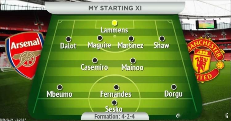 曼晚预测曼联vs阿森纳首发:多尔古左边锋,卡塞米罗、梅努出战北京时间1月26号凌晨0点30,英超第23轮曼联将客战阿森纳,曼彻斯特晚报对曼联此役的首发进行了预测。曼联阿森纳 曼晚两名记者预测的首发不同之处在于中锋、右边锋的人选。记者Tyrone Marshall预测门将:拉门斯后卫:达洛特、马奎尔、利桑德罗·马丁内斯、卢克·肖中场:卡塞米罗、B费、梅努前锋:阿玛德、姆伯莫、多尔古记者Jack Flintham预测门将:拉门斯后卫:达洛特、马奎尔、利桑德罗·马丁内斯、卢克·肖中场:卡塞米罗、B费、梅努前锋:姆伯莫、舍什科、多尔古