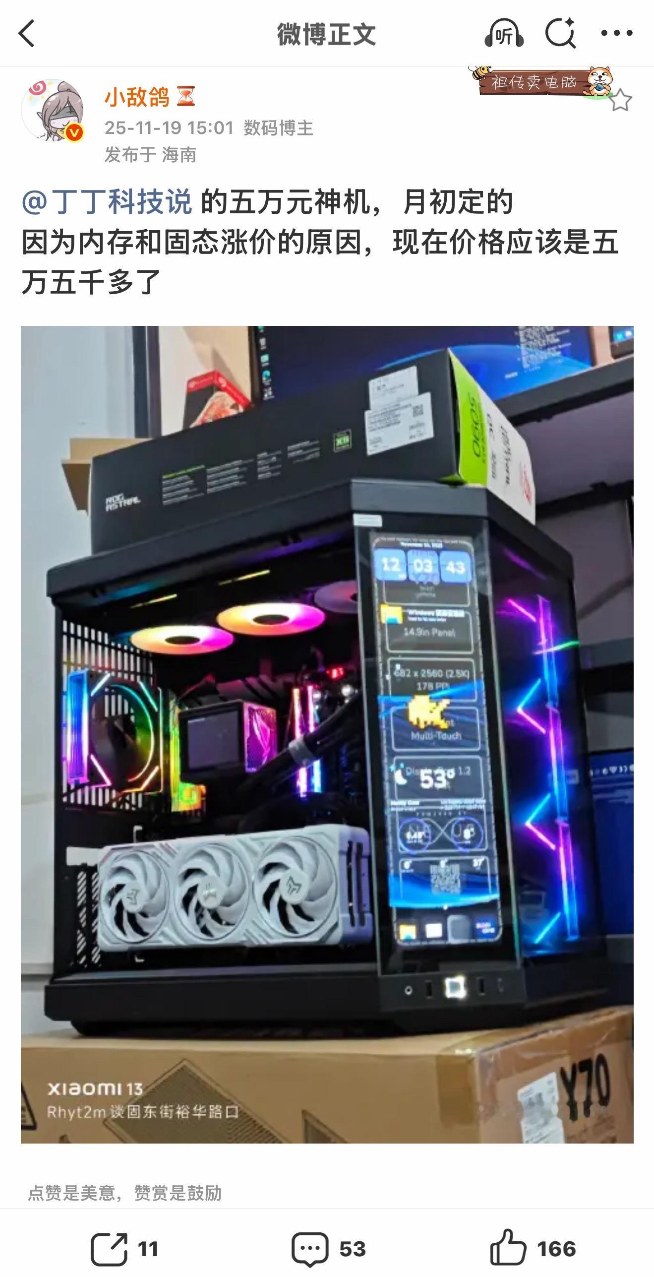 去年11月份找配的台式机,96g+5090,花了五万多。11月中旬产品还没收到,就涨了…截至目前,已经涨到6万多了我明明一直出差还没怎么玩,怎么就给我赚钱了显卡台式机内存