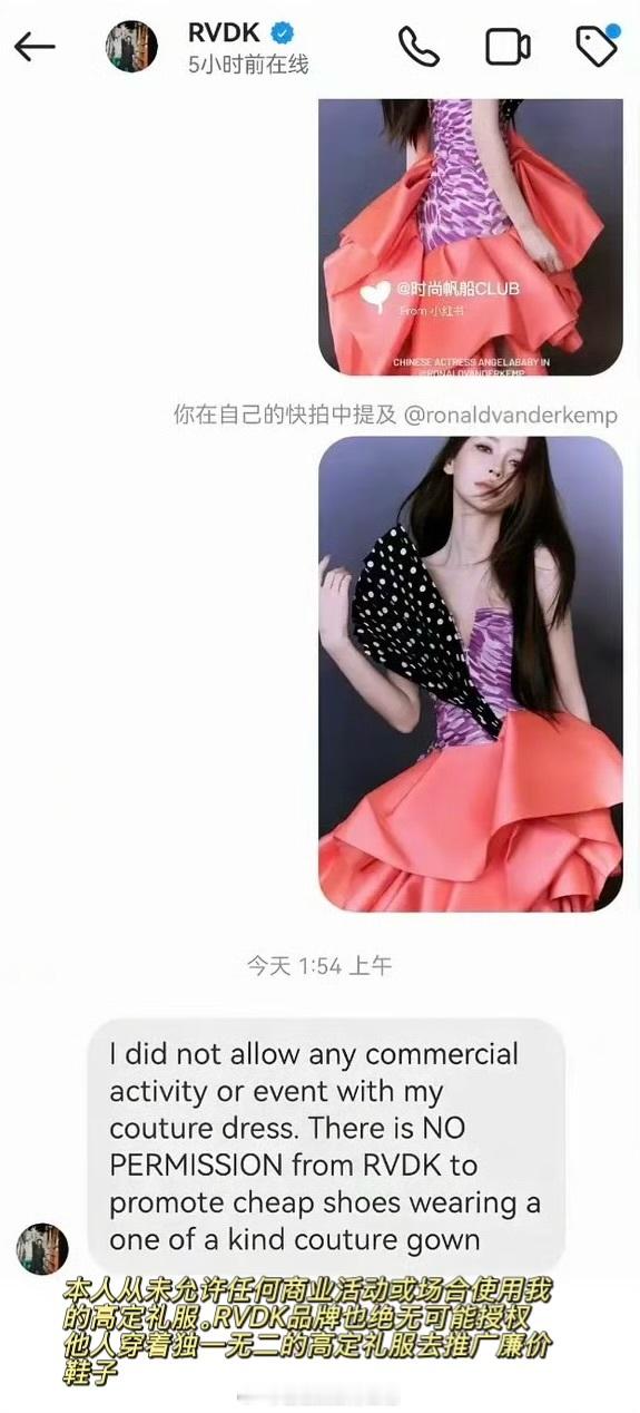 额,angelababy杨颖穿着高定衣服做红蜻蜓的直播,被设计师bb了红蜻蜓依然和ab在合作,这两天她去直播间卖鞋子。穿的是Ronald van der Kemp 品牌2024秋冬高定礼服。设计师说:品牌不允许任何人穿着高定礼服推广廉价鞋子