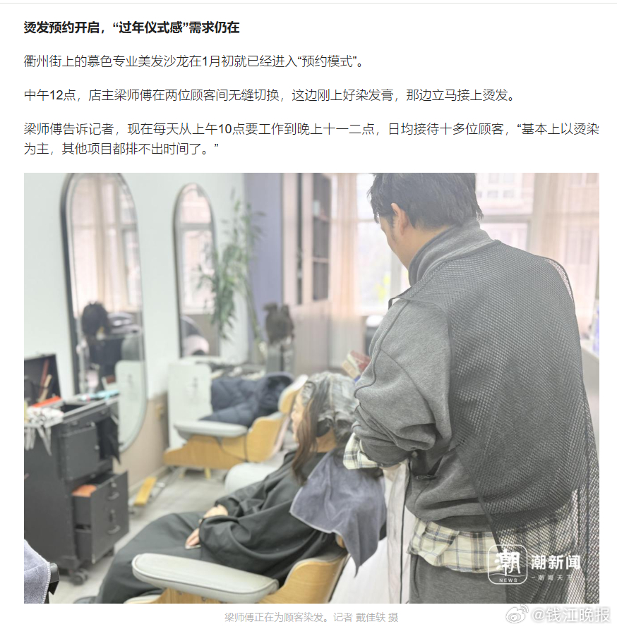 【#过年三件套开启预约模式#】美发、美甲、美睫,这被不少人戏称为“过年三件套”。1月25日,记者走访了杭州市区多家理发店、美甲美睫店,“三件套”的预约热度正逐渐攀升中。“都要提前一个礼拜左右预约,不然很难排上。”慕色专业美发沙龙的梁师傅表示,店里只有他一位理发师,临时上门的顾客很大几率没法接待,“很多客人已经形成习惯,每年快过年时就会提前打招呼,让我把时间安排好。”这种忙碌会持续到什么时候?梁师傅笑称:“持续到我回家那天。”梁师傅计划小年过后休息,而在此之前,店面几乎无空档期。在杭州经营美甲美睫店八年多的周女士说,眼下客流量虽不算稳定,但预约订单已逐步递增,“月底会更忙一些,大家一般提前半个月扎堆来做,美甲美睫能维持更久,刚好撑过整个春节。”为了应对旺季,周女士和三位同事早早就做好了准备,“我们已经备足所有耗材,避免年前断货、配货不及,耽误顾客做造型。”腊月渐深,年味愈浓,你的“过年三件套”,安排上了吗? (潮新闻 记者 戴佳轶)