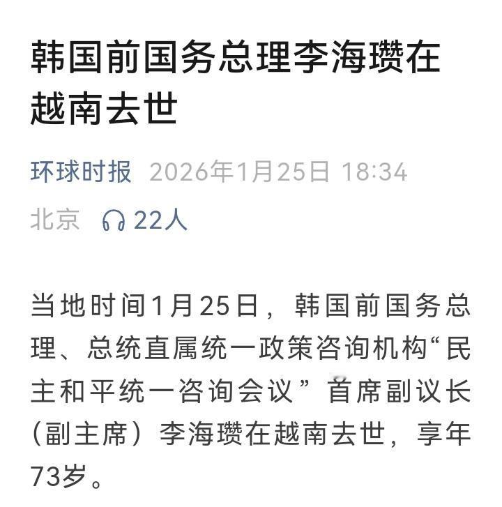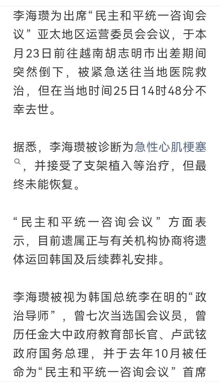 73岁了还上班,倒在异国土地上,韩国前总理的最后一程让人感慨(详见附图)! 刚看到新闻时我愣了三秒——等等,退休官员怎么比996上班族还拼? 李海瓒这次去越南据说是做“民间外交”,结果突发心梗,客死他乡。网友神评论:“这算工伤还是出差事故?”玩笑背后是个扎心的现实:多少退下来的人,名片上那个“前”字永远擦不掉,电话比在位时还接得还勤。 看看他的退休生活轨迹:当过三届议员、两次党魁、一任总理,退下来后各种协会会长的头衔接到手软。73岁本该享清福、逗孙子的年纪,还在跨国航班上奔波。有人说这是敬业,要我说,这是没学会“给自己关机”。 现在有些退休官员的日程表比上班时还满:研讨会上要坐主席台,企业开业得剪彩,出国考察变身“民间大使”……好像卸任只是换了张更自由的名片。结果呢?身体报警了还当成闹钟按掉。 李海瓒这事给所有“退而不休”的人敲了一记闷棍:退休金难道不比项目分红踏实?陪孙子搭乐高不比陪老板打高尔夫开心?非要等到躺在异国病床上的最后一刻,才想起家里后院荒了十年的花圃。 建议所有功成身退的大佬们:手机设个下午五点自动勿扰,护照锁进抽屉最里面。真想发挥余热,小区垃圾分类督导员的岗位一直缺人——至少万一晕倒了,邻居能马上送你去医院。