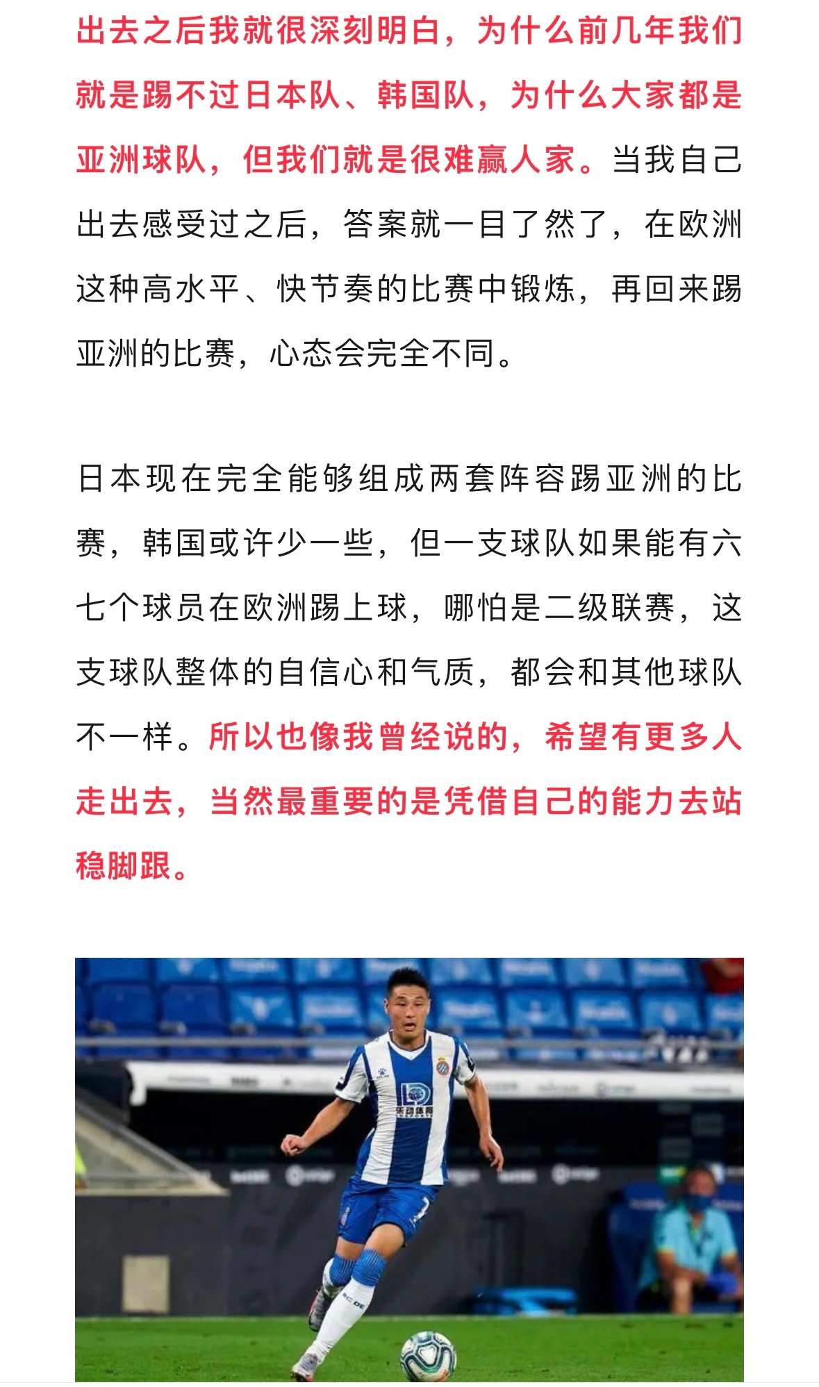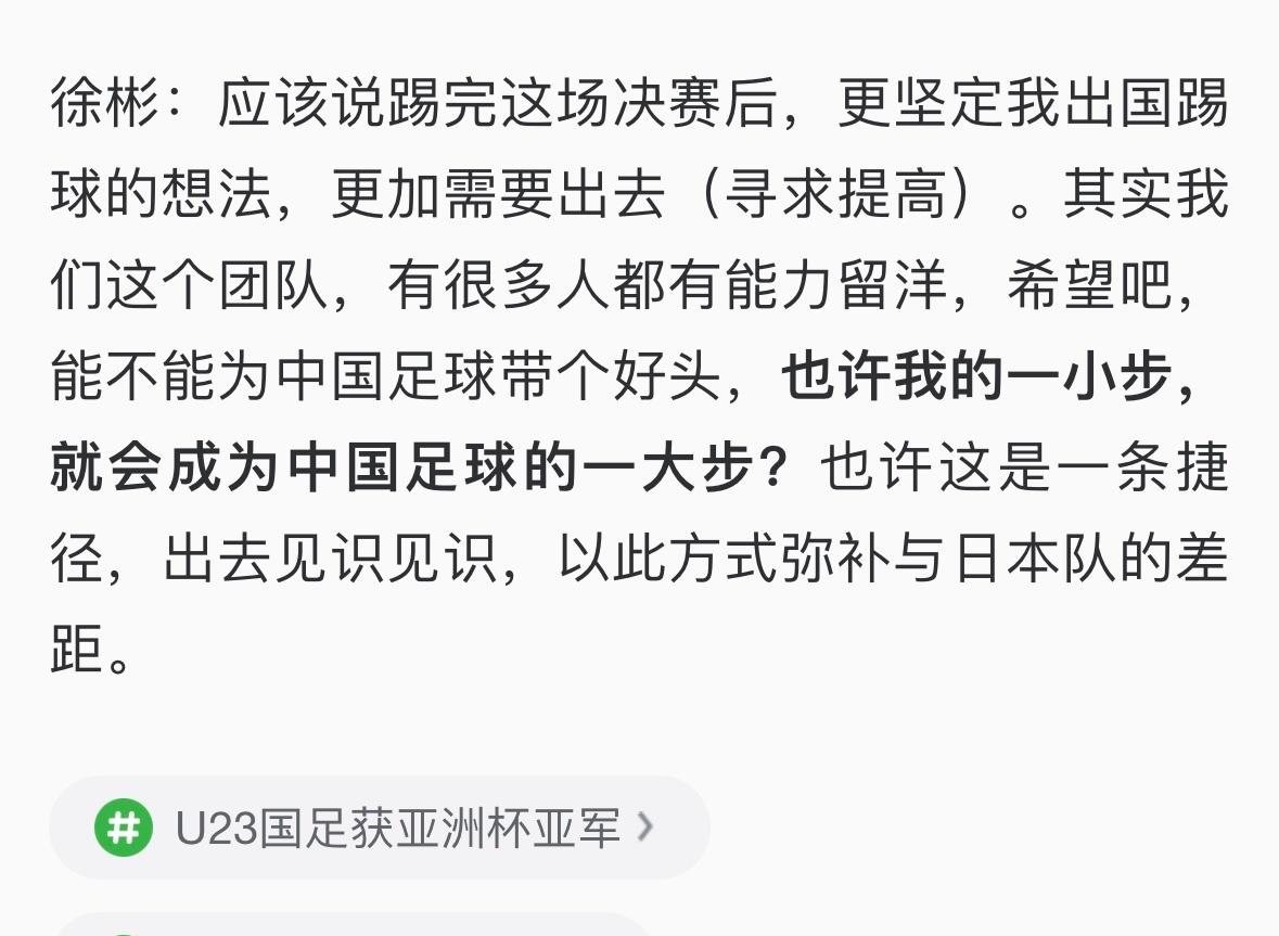 看到徐彬接受采访时了这样一段话,他说输掉决赛后更坚定了留洋的决心。于是想起了前一届世预赛40强赛出线后,采访武磊时他说过得一段话,在真正走出去看过那些节奏、强度以及逐渐遍地开花的其他国家留洋球员后,武磊更加清楚与日韩这些国家足球整体水平的距离。当初武磊走过的路,也许会有机会被越来越多的年轻人去延续,而这样的认知、这样的决心,才是中国足球得以在今后有机会继续得到提升的基础u23亚洲杯徐彬说正视差距后更需要走出去武磊
