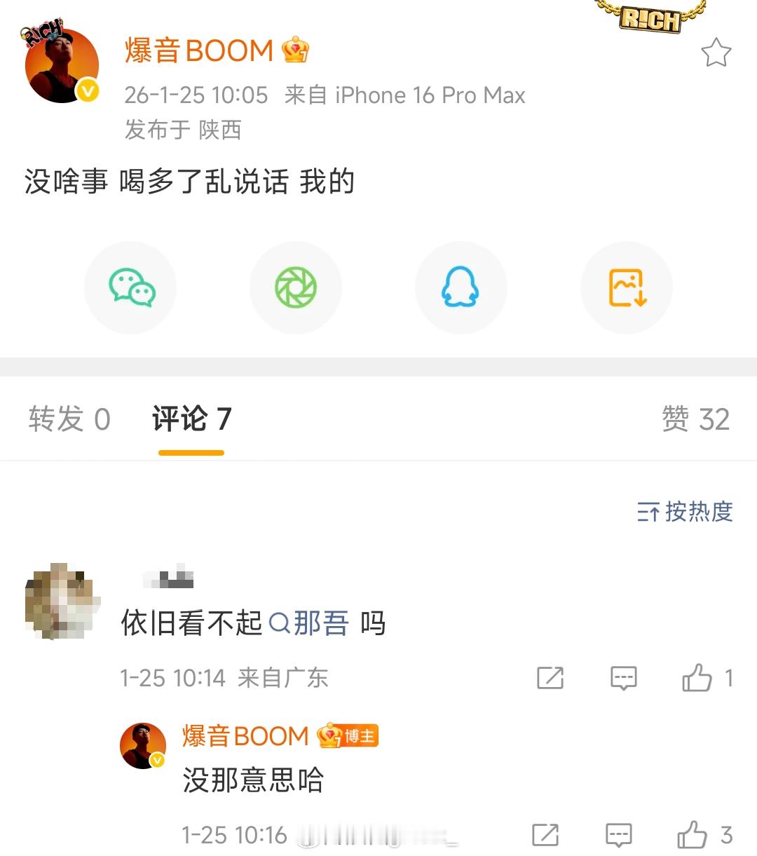 爆音发文回应“自己被那吾克热打了”:喝多了乱说话,我的。另外爆音还回应网友质疑他
