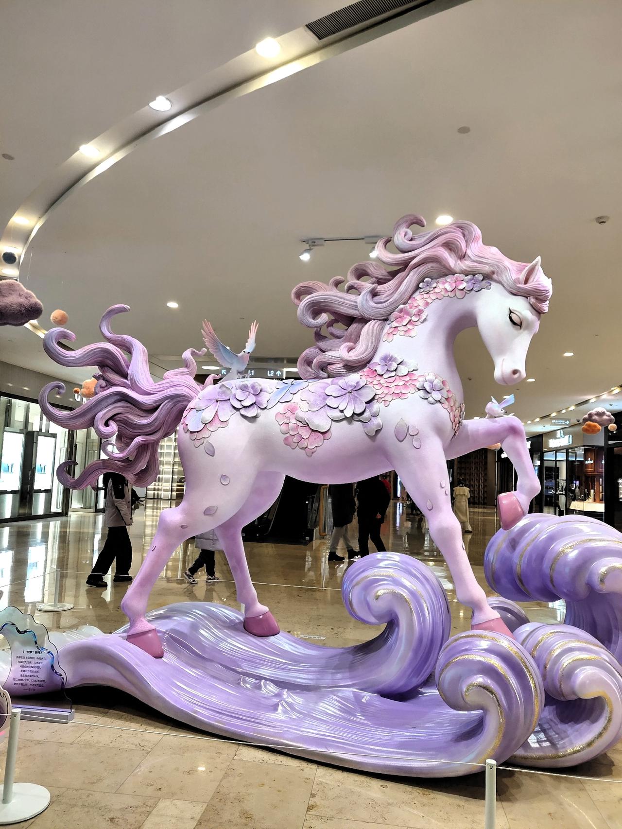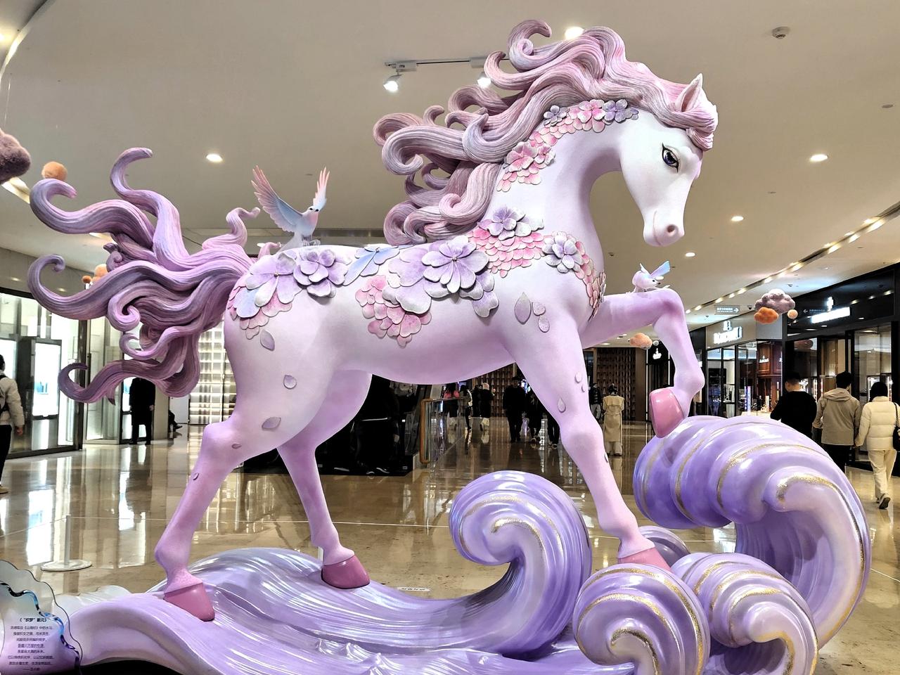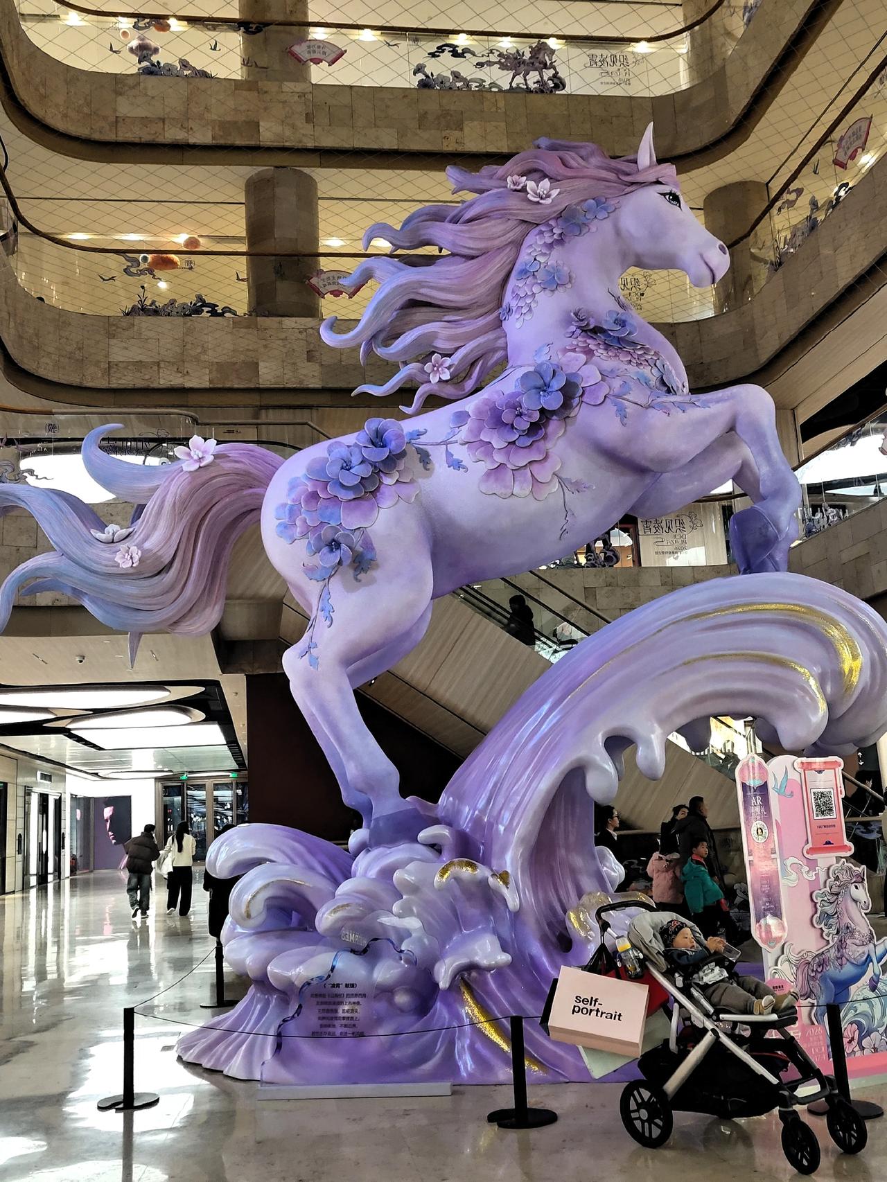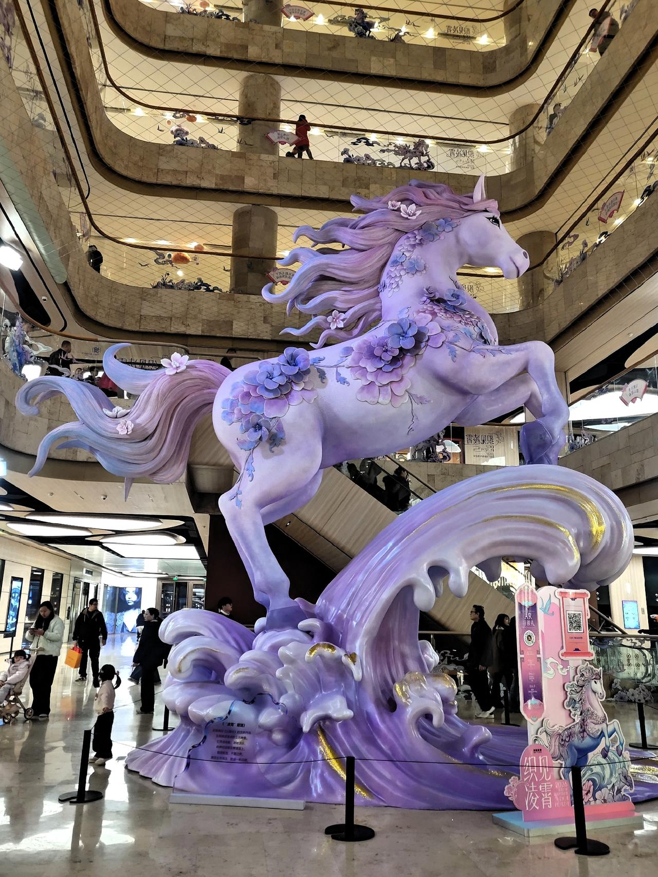 今天特地去德基拍了两匹马, 一匹叫“凌霄”, 另一匹叫“织梦”, 凌霄昂首扬鬃、踏浪飞奔, 代表奋进、自信、开拓、坚毅, 织梦低头推浪、温柔含蓄, 代表蓄力、低调、务实、自律, 一动一静的织梦和凌霄, 传递了新春吉祥纳福, 步步高升的愿景。 马身镶满花朵, 一双长长睫毛的眼睛一眨一眨, 粉紫的色彩, 温柔又浪漫, 仿佛在呼唤寻梦的年轻人, 勇敢的追求美好生活。 春风得意马蹄疾, 一日看尽金陵花。 你觉得好看吗? 这两匹仙女马, 一匹在德基一期, 一匹在德基二期。