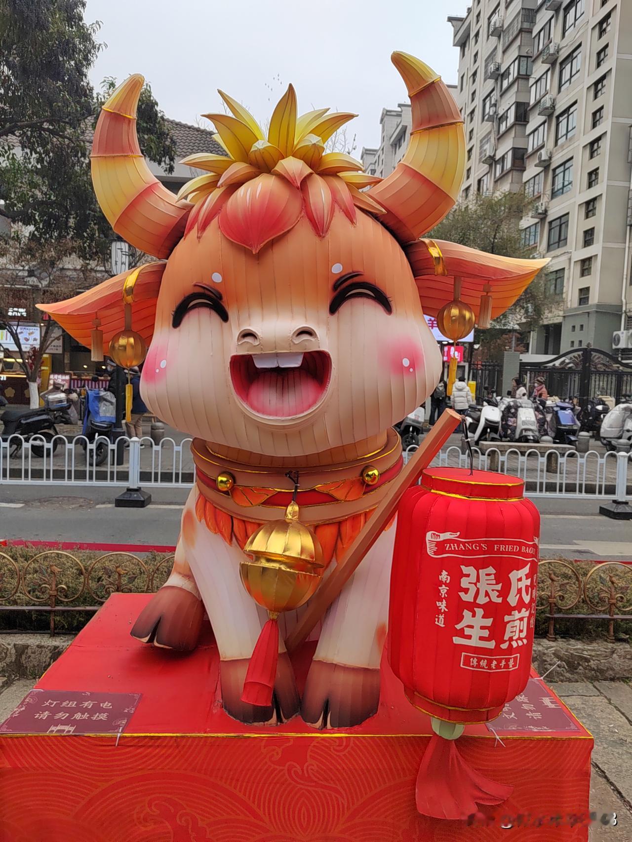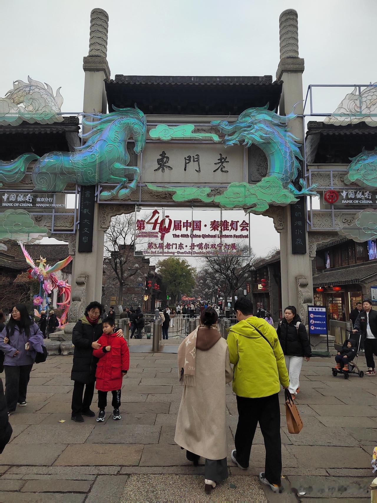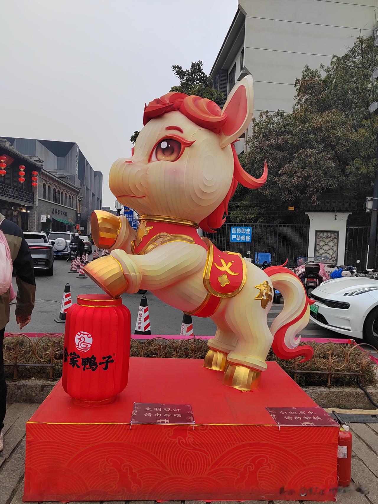 今天南京市天气阴有小雨,最高温度11℃,与昨天变化不大,未来两天有雨。 下午和老伴两人坐公交车到老门东逛一逛,从长乐路沿箍桶巷进入老门东,路口的长乐坊室外正在进行地面铺装施工,部分人行道被占用,行走要格外小心。 从牌坊处进入老门东,步行街两侧布置了大型花灯,步行街中间绿化带内布设了十二生肖花灯,正南面的明城墙下布置了一组生肖马超大型花灯,吸引大家打卡拍照。 有时间的话一定要晚上亮灯时来老门东看花灯,那才叫漂亮。