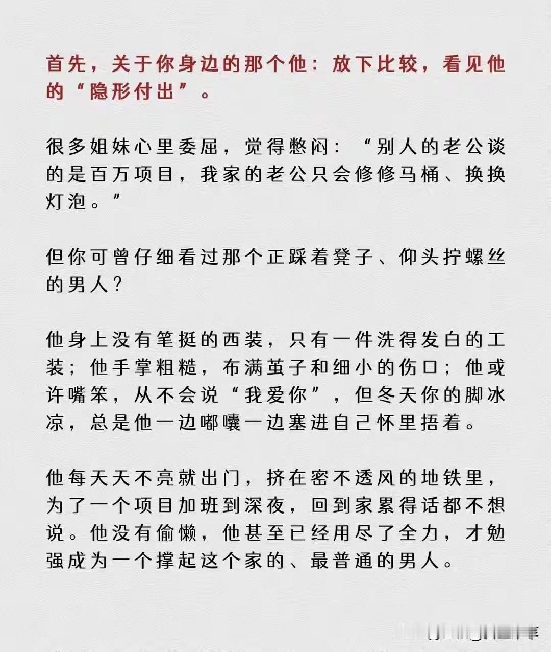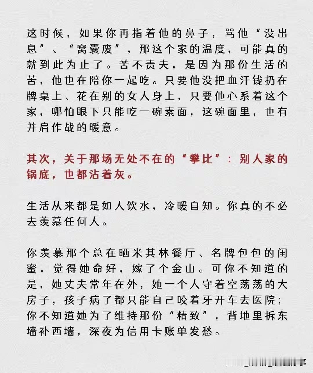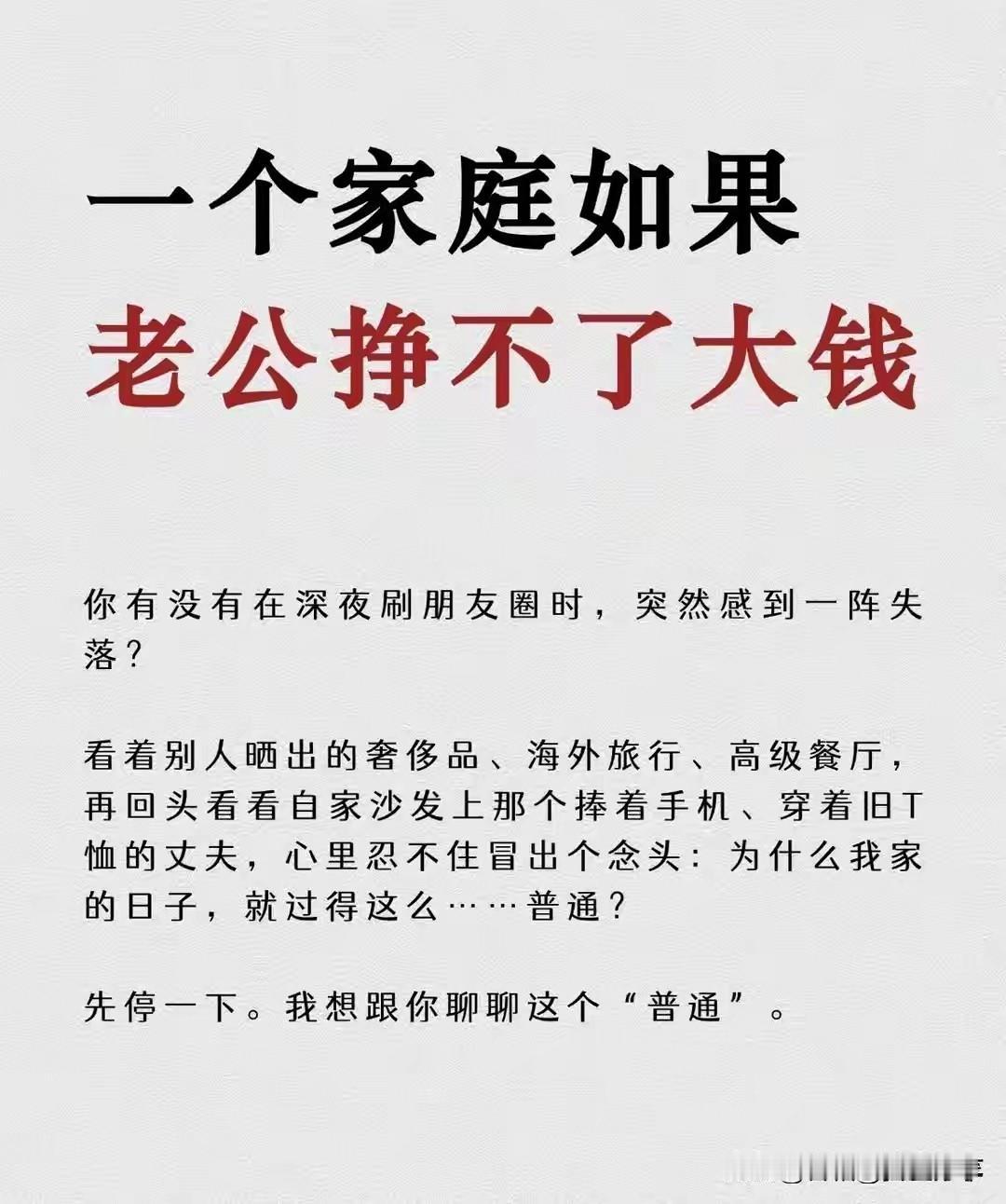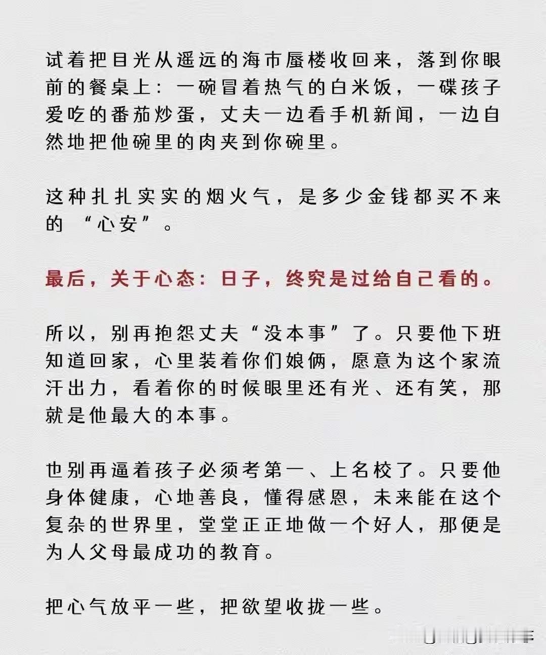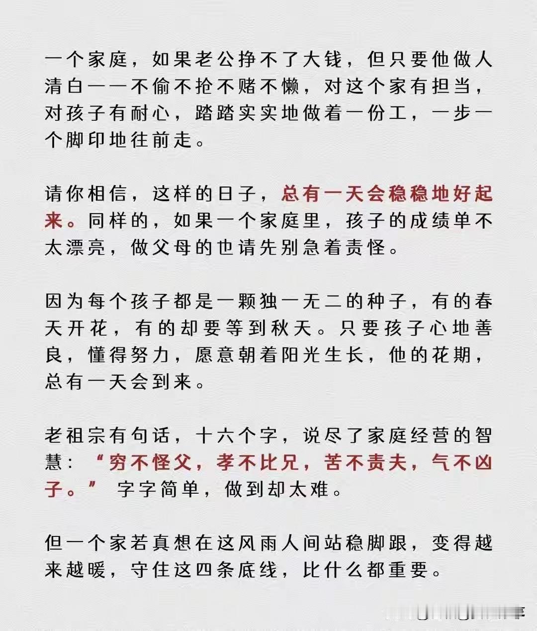 一个家庭如果老公挣不了大钱,孩子没有漂亮的成绩,都请不要抱怨! 因为男人最重要是踏实! 孩子最重要是等待! 而女人最重要的是守住这个家!静待花开!
