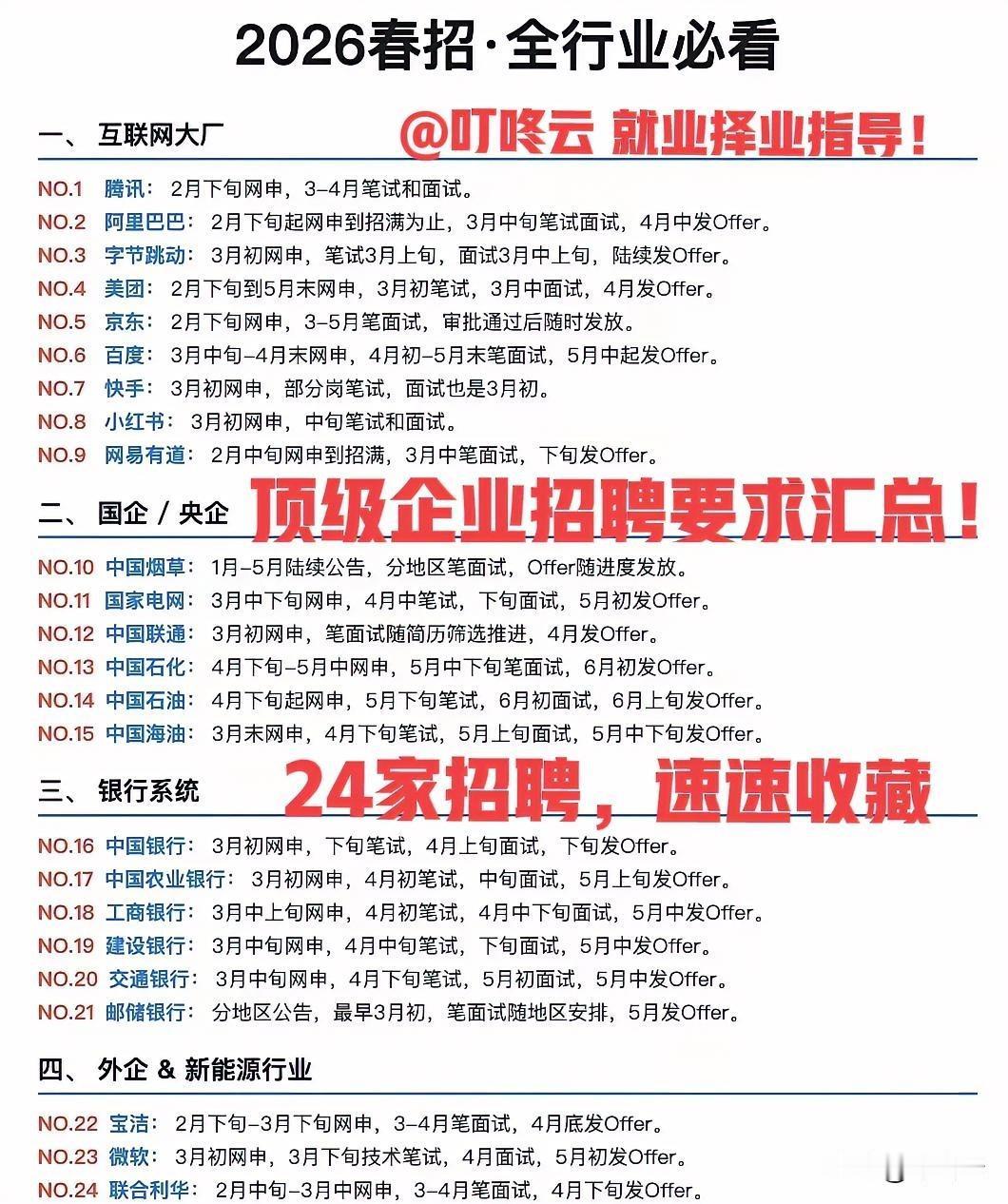 最新招聘汇总!24家顶级企业招聘汇总合集!就业择业,萝卜青菜,各有所爱!互联网大厂、国央企、银行系统、外企等在招的企业全面汇总!腾讯、阿里、字节跳动、美团、京东等等TOP级大厂统统都有!中国烟草、国家电网、中国石化等等国央企都在这里!速速围观揭秘详细内容![烟花][烟花][招财进宝][招财进宝] 欢迎关注@叮咚云 将优先为粉丝职业规划指导,为你定制最适合的就业择业方案!欢迎留言交流讨论。[来看我][来看我] 免责声明:图片来自网络,仅供参考!