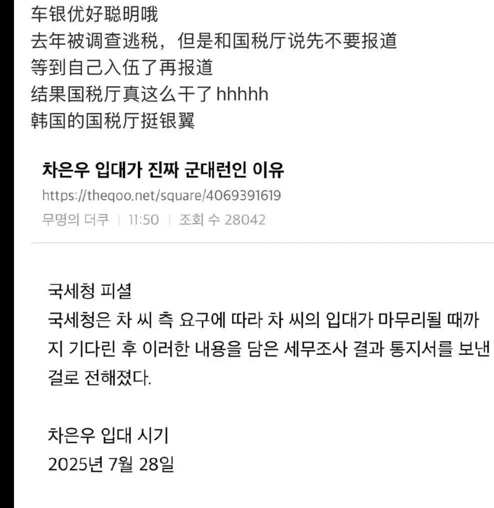 韩国顶流男星车银优最近摊上大事了!去年春天,首尔国税厅对他展开高强度税务调查,结果今年1月22日直接通知他补缴超过200亿韩元的税款,折合人民币差不多一个亿,这数字直接刷新了韩国艺人被追税的最高纪录。 事情起因是车银优的收入分配方式有猫腻。他所属的Fantagio公司跟母亲成立的A公司签了份“演艺活动支持服务合同”,收入分成三份:Fantagio、A公司和他本人。国税厅查下来认定A公司基本没干实事,就是个空壳,注册地在江华岛偏远地方,没实体办公,也没提供跟Fantagio不一样的实际服务。目的很明显,就是把本该缴45%个人所得税的部分,转成公司名义只缴20%多点的法人税,少交一大笔。 Fantagio也受牵连,被认定开了虚假发票,已补缴82亿韩元。车银优去年7月入伍前就知道这事,还申请延迟发通知书,等他服役后再公布。现在他正在服兵役,经纪公司已经提出异议审查,坚称A公司是正规的文化艺术企划公司,母亲是为了保护儿子事业才亲自管,不是避税。 韩国税法对大额逃税有明确规定,超一定额度可能面临刑事责任,但一般是缓刑加巨额罚款和事业重创。像宋慧乔当年涉案金额才车银优的几分之一,就低调了好一阵子,这次金额这么夸张,对他影响肯定更大。韩国娱乐圈这种通过亲属公司分流收入的操作不算新鲜,但国税厅这次下狠手,明显是要杀鸡儆猴,整顿行业乱象。 车银优作为靠脸吃饭的顶级偶像,形象崩了事业难保。艺人赚得多就该老实纳税,钻空子迟早翻车,这次教训够深刻,圈里其他人也得掂量掂量。车银优 IU车银优