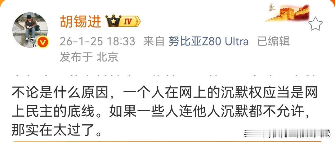 打败老胡的永远是明天的老胡……[看][看][看] 25年4月24日,胡锡进:董明珠应该道歉。希望她听得进批评。 26年1月25日,胡锡进:不论是什么原因,一个人在网上的沉默权应当是网上民主的底线。如果一些人连他人沉默都不允许,那实在太过了。 不愧是严于他人而宽于自己的老胡,真棒!