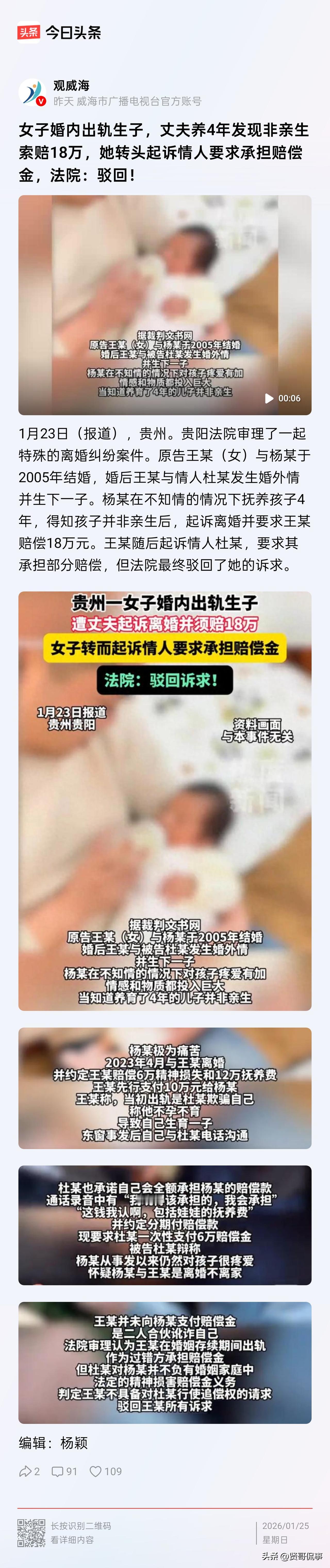 “都是出轨惹得祸!”贵州贵阳,一女子结婚14年后,又同小其10岁的男子暗通款曲,勾搭在了一起,并且怀孕生下了孩子。丈夫因女子的隐瞒,尽心尽力抚养孩子长达4年。4年后,男子得知真相,便果断同女子离了婚,还让她赔偿18万元。女子先付了10万元,剩下有6万元的精神损失,女子便找到情夫,认为他也有责任,希望他能偿还。情夫不愿,女子一纸诉状告上了法院。对此,法院的态度很明确。 王某和杨先生于2005年领证结婚,婚后,两人的感情虽不算很和睦,但勉强也能过下去。 然而,2019年前后,事情出现了转折。王某竟出轨比自己小10岁的杜某,在两人发生关系后,王某意外怀孕并产子。 那么对这一事实,她选择了刻意隐瞒,最终让杨先生误以为孩子是亲生的。 不知情的杨先生被蒙在鼓里,满心欢喜,尽心尽力抚养孩子长达4年。 可俗话说,纸终究包不住火,4年后,杨先生得知了这一事实,当场怒不可遏,提出了离婚。 随后,王某与杨先生签署《离婚协议书》,约定王某因婚内出轨赔偿杨先生精神损害赔偿金6万元、4年抚养费12万元,合计18万元分三期支付。 离婚后,王某按约支付了10万元,随后她找到杜某,要求其承担其中6万元精神损害赔偿金,称二人是共同出轨,且杜某曾承诺承担相关费用,但遭杜某明确拒绝。 在协商无果,王某将杜某诉至法院,也起诉向杜某索要抚养费。 法院会怎么判呢? 一、非婚生子女的抚养费,生父必须承担,这是毋庸置疑的! 《民法典》第1071条规定,非婚生子女享有与婚生子女同等的权利,不直接抚养的生父或生母,应负担未成年子女的抚养费。 杜某作为孩子的亲生父亲,血缘关系无法割裂,抚养义务是法定的,即便孩子是婚外所生,也必须支付抚养费至孩子成年。 二、6万精神损害赔偿金,杜某又是否要承担呢? 《民法典》第1091条明确,因重婚、与他人同居等重大过错导致离婚的,无过错方有权请求损害赔偿。 这笔6万元赔偿金,是王某作为婚姻过错方,对无过错方杨先生的精神补偿,是其单独的法律责任。 王某与杜某的婚外情是双方自愿行为,二者间无侵权关系,且王某无证据证明杜某曾承诺承担该费用,杜某自然也不用承担。 所以,最终法院判令杜某向孩子支付抚养费,驳回了王某索要6万元赔偿金的诉求。 总的来说,王某出轨没有任何正当性可言,其最终的结果也无异于是自掘坟墓。 现如今,王某落得个人财两空、众人唾弃的下场,完全系其咎由自取! 婚姻的底线是忠诚,如果感觉自己无法去守住这份忠诚,不如和另一半如实坦诚并体面告别。切勿敷衍和背叛,消耗彼此,最终害人害己! 对此,你怎么看?欢迎大家在评论区留言。(注:图片仅供示意)