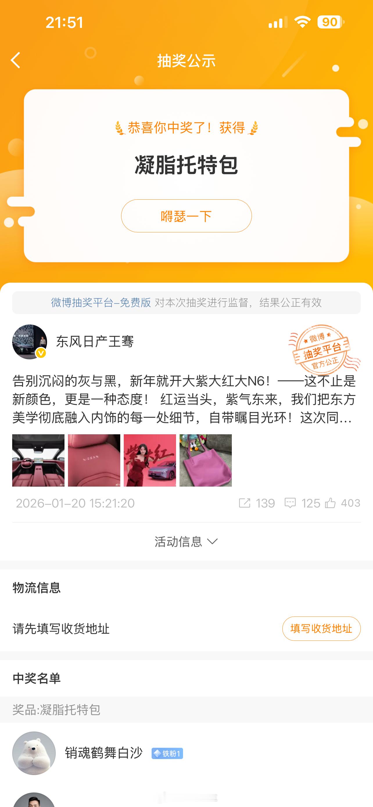 在骞总微博抽中一个东风日产N6大紫大红凝脂托特包~✌️把这份爱传递下去。即可参与。这个包最近我也在背,真的很好用。特别软,很舒服。抽奖详情 广州