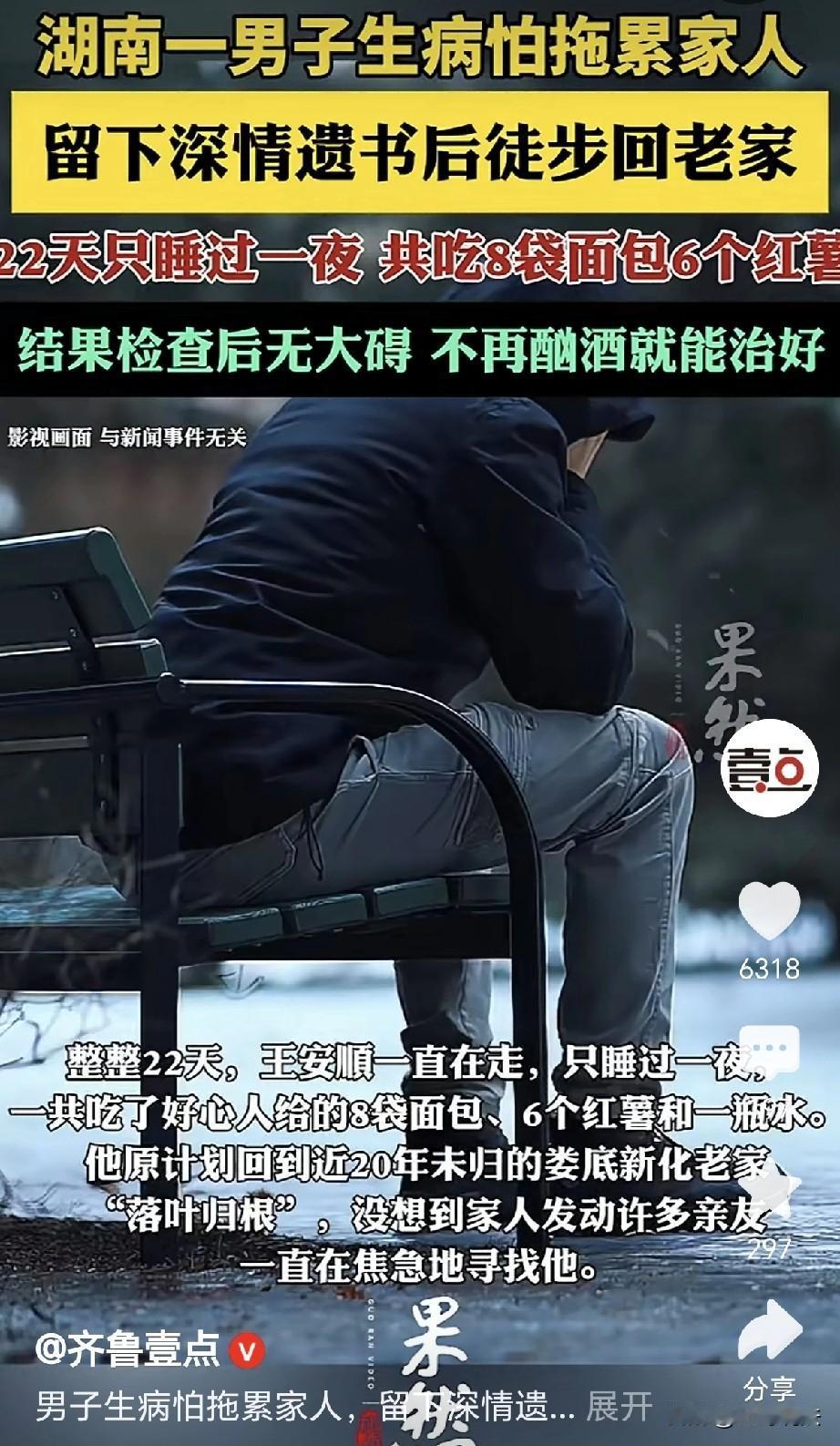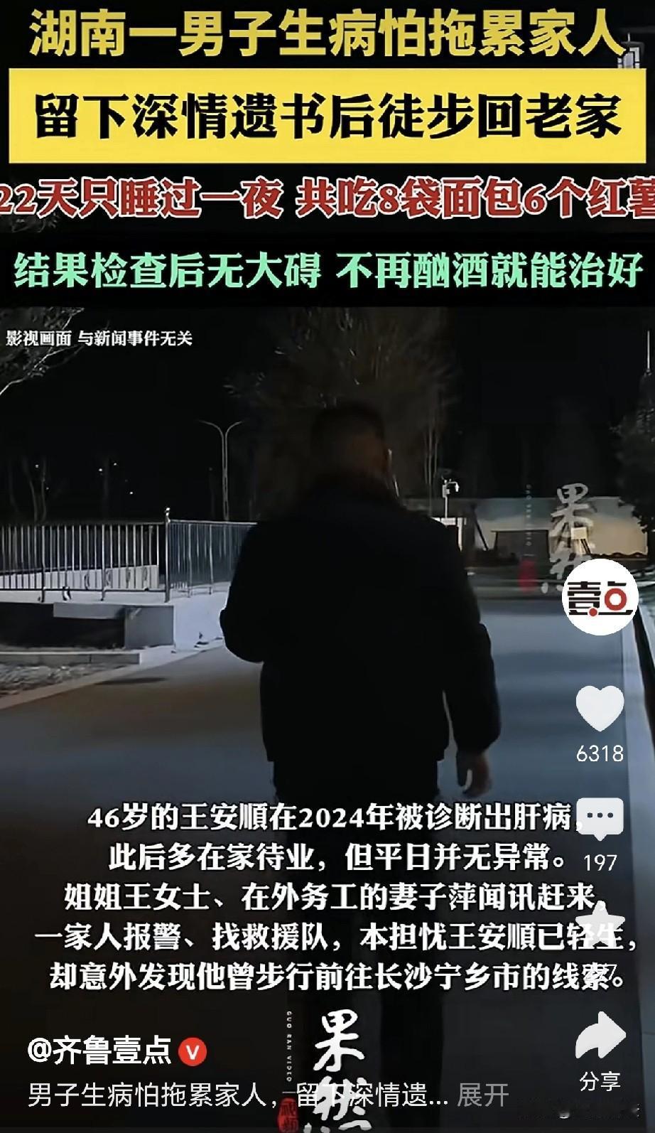 被吓懵了!湖南湘潭,一46岁男子得了肝病,他以为是绝症,给妻子写了一封深情的信: 深爱的萍,我这辈子到这里就算完了,辜负了你对我的爱,下辈子再来报答……,写完之后,他放下手机和钱,离家出走,计划回到老家,给爷爷上坟,然后结束生命,不再拖累家人,谁知岳母看到了信,立刻通知所有家人,家人千辛万苦,总算找到男子,他走了22天,只睡过一夜,吃了好心人给的8袋面包、6个红薯和一瓶水,家人带他去医院一查,万幸,压根就不是他想的绝症,网友: 遇到的都是好人! 王安顺46岁,有个姐姐和一个弟弟,姐姐出嫁,父亲不久后就去世了,王安顺和弟弟,来到湘潭当了上门女婿。 2024年的时候,王安顺身体不适,到医院一查,被查出了肝病。 从此之后,王安顺不再工作,大多数时间都在家里躺平。 可是他的妻子,为了生计,还在外面打工挣钱,养活孩子,给他看病,根本少不了经济的支撑。 可是他思来想去,决的自己的人生已经到头,他可不想去医院医治,他怕病没治好,家底子也会被他掏空。 于是他下了决心,他要回到老家,到爷爷奶奶的坟前祭奠一下,他要落叶归根,就是死也要死到自己家里。 可是他又转念一想,自己的妻子美丽贤惠,这么多年对他真心实意,直到现在还在外面辛苦打工。 于是他找来了纸笔,深情的给妻子写了封信,心里面的内容,令人感到十分的动容。 王安顺在信里写道: 深爱的萍,我这辈子到这里就算完了,辜负了你对我的爱,下辈子再来报答…… 他写完之后,把手机和钱全部留下,他穿上那一件姐姐给他买的皮衣,义无反顾就往家外面走去。 他离开之后,没过多久,岳母给他打来了电话,要他赶紧接她回家。 谁知电话关机,岳母担心,干忙就往女儿家里跑去。 她推门一看,家里静悄悄的,王安顺压根不在,可他的手机和钱却在桌子上好好的隔着。 岳母到跟前一看,立刻就发现了那一封给妻子的信,王安顺在信里,给妻子告别。 他在信里还写了自己都干了哪些活,工钱又是多少,他都留给妻子,下辈子再来报答。 岳母一看,这不得了,王安顺是要轻生,他不想再继续活了。 岳母立刻通知了所有的家人,妻子萍匆匆赶回,王安顺的姐姐王女士也回来了,他们报警,希望警方能帮助寻人。 经过一番搜索,四周无人,王女士在一家诊所的视频里看到了弟弟的行踪。 警车拉着他们一路搜寻,终于在去往长沙的半道上拦住了蓬头垢面的王安顺。 原来,王安顺出走以来,他身无分文,也没有手机,有一位好心人要给他钱,可商店无法兑换,好心人给他买了8个面包,还有一瓶水。 王安顺继续前行,又有好心人给了他6个红薯,他就靠着这些,一直在路上走了22天。 王女士找到他时,他已经灰头土面,污垢不堪,身上的皮衣也不成了样子。 他掩面哭泣,不愿意再面对家人,他觉得自己得了绝症,不能干活,还要花钱,是他拖累了自己的家人。 这一路上,他一直走着,只睡过一次,还是在一个草很高的棚子里休息。 家人看他平安,高兴的眼泪都流了出来,王女士立刻带他回去洗漱剪发,又给他换上了干净的衣服。 家人带他到医院检查,医生发现他已经断药2个月了,医生表示,他的病并非绝症,压根没有他想的严重。 他得的是肝硬化腹水,病情并不严重,他之前有过酗酒的习惯,只要以后不喝,病情很快就会控制。 医生的话,顿时让王安顺低头羞愧,因为他的无知,给家人带来了极大的担心。 既然如此,他大可不必再担心下去,他有医保,看病也不会拖累到别人。 这次出走,他改掉了酗酒,妻子和女儿万分的高兴。 1 月 17 日,王女士一家给派出所的叔叔们送去锦旗,感激他们给予的帮助。 王安顺终于在亲情和叔叔们的关爱下,终于走出了阴霾,重获新生。 人吃五谷杂粮,哪有不生病的,王安顺心疼妻子,唯恐自己的病会拖累到她。 王安顺是个好人,亲人家属也都是善良之人,一路上他遇到的都是贵人,帮助他完成了这趟旅程。 8袋面包6个红薯挽救了一条生命,给好心人点赞,愿天下好心人一生平安。 王安顺也不是没有收获,他也终于知道自己是被家人爱着,万幸的是,医生告诉他并非绝症,千万不要轻易放弃自己的生命。