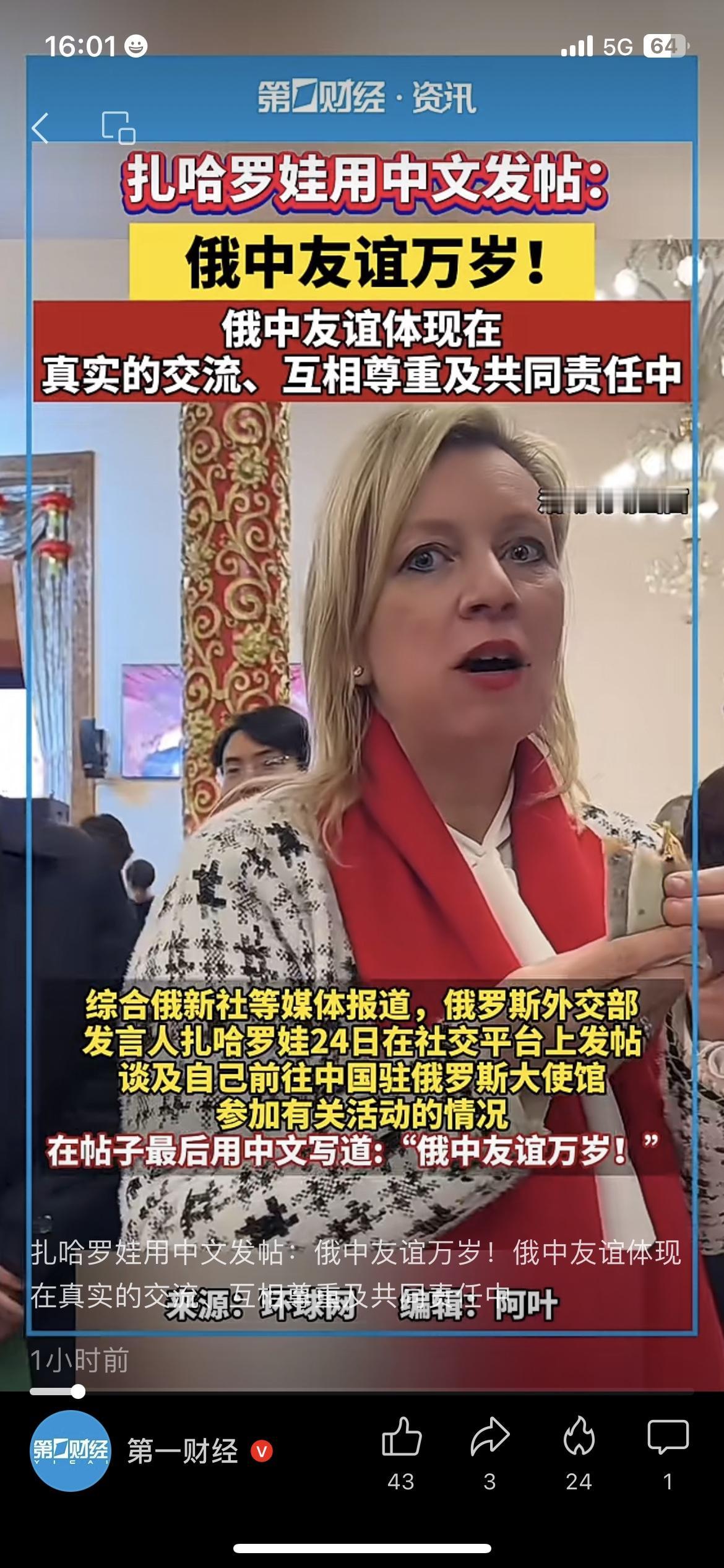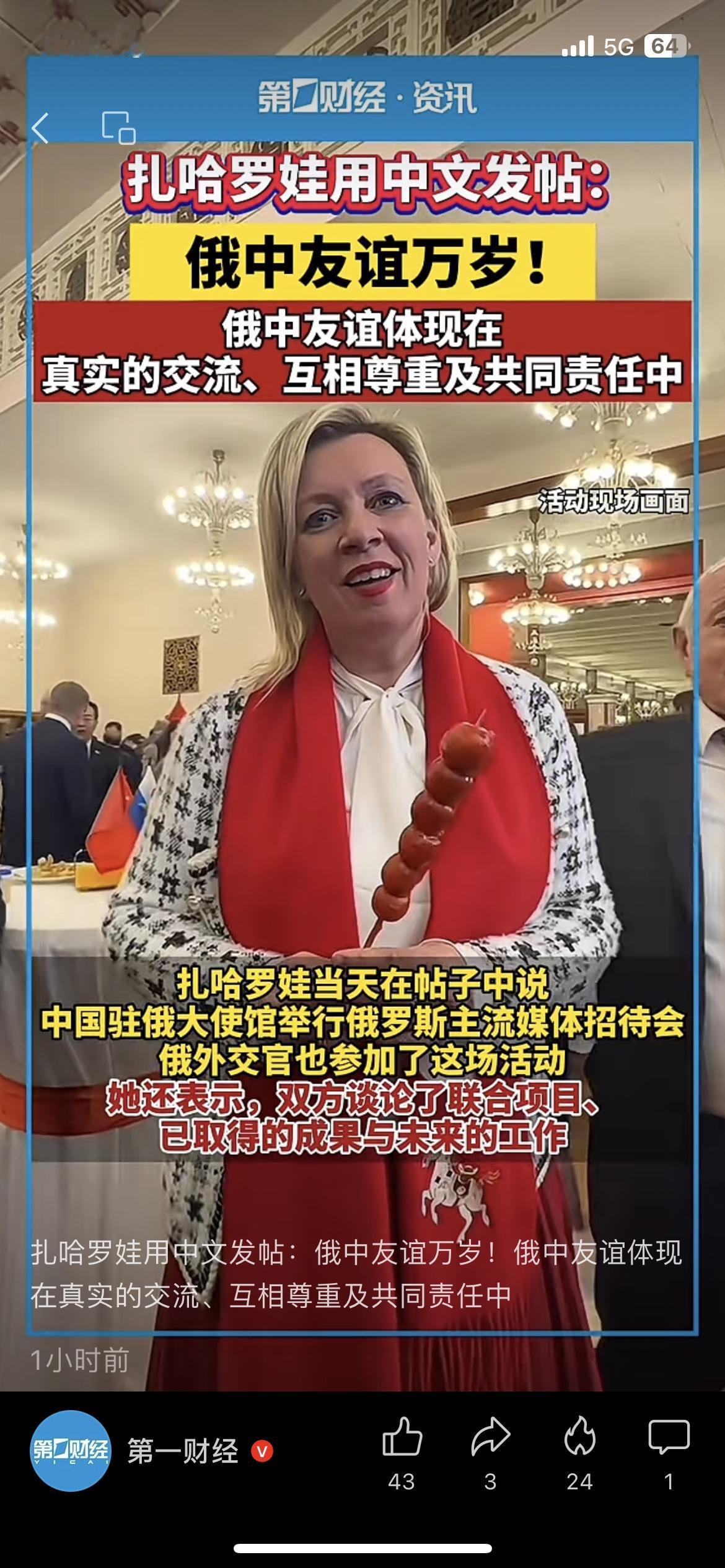 ❤️扎哈罗娃暖心秀中文! 参加中国驻俄使馆活动后,特意用中文发帖喊出“俄中友谊万岁”,强调两国友谊源于真实交流与互相尊重,这波互动太戳心了! 你觉得这波互动会让中俄关系更紧密吗? 扎哈罗娃 中俄友谊