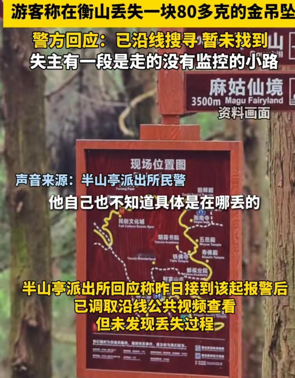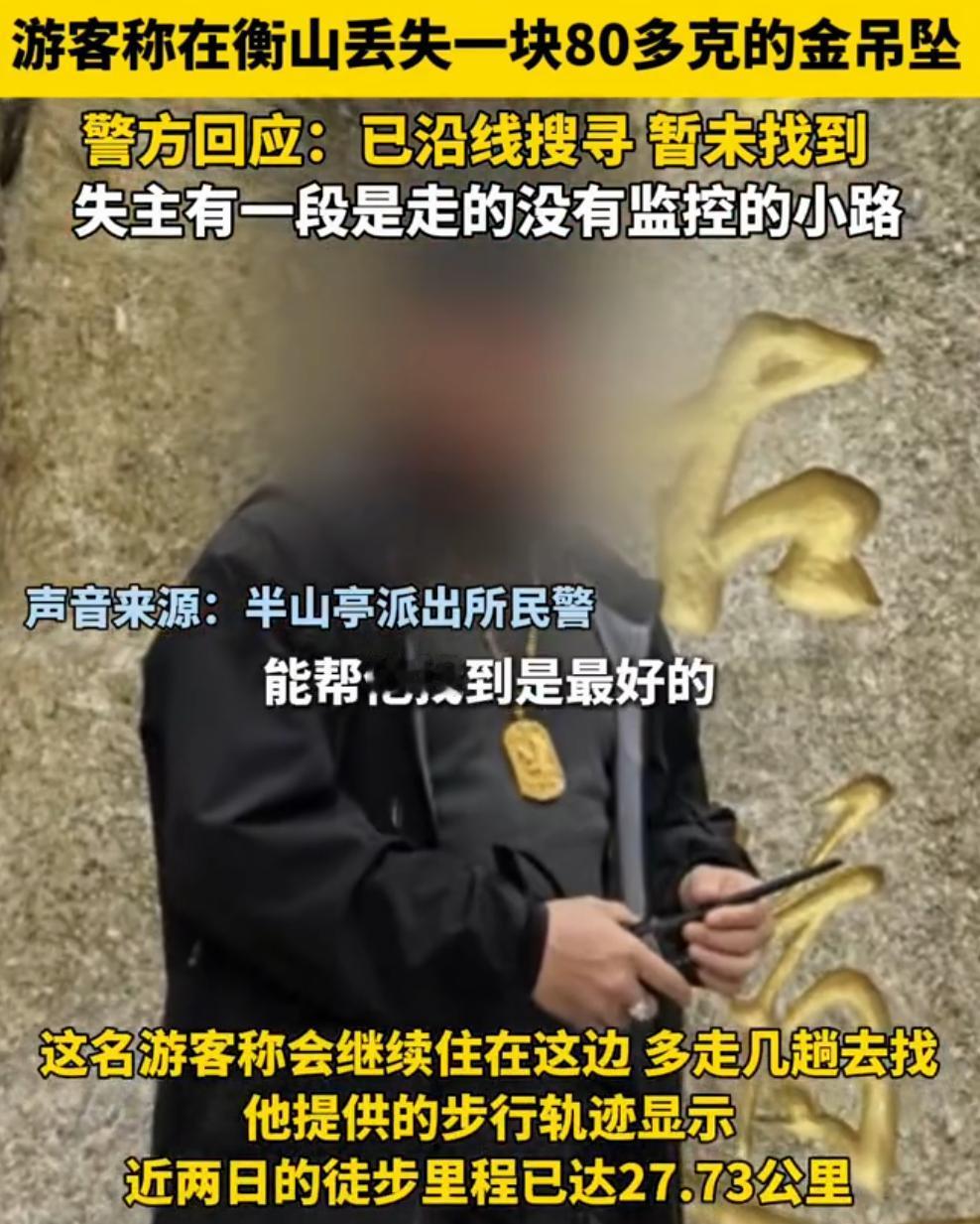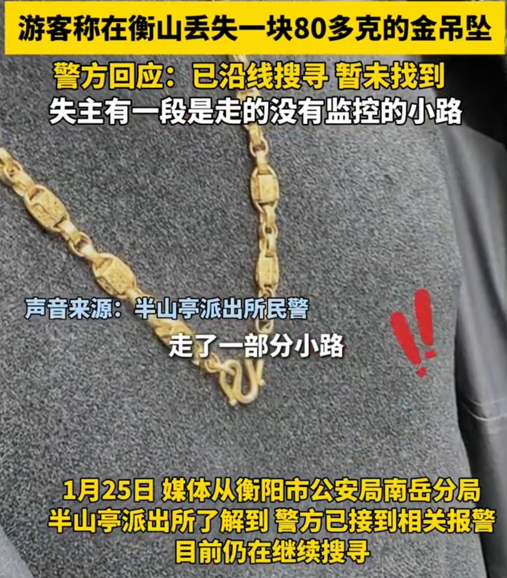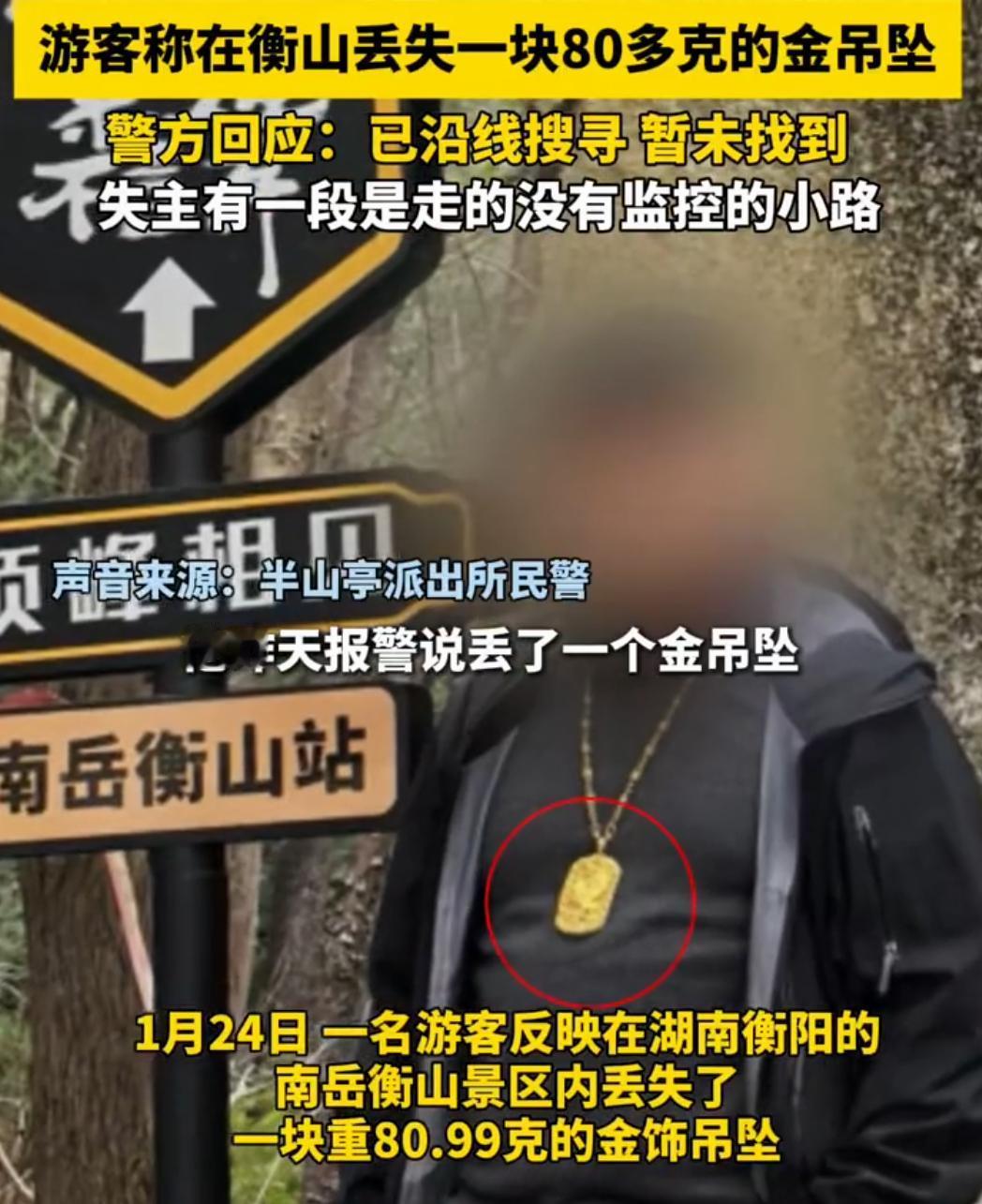 亏大了!爬趟山小十万没了! 1月24日,一男子在湖南衡山景区丢失了80.99克金吊坠。 发现失丢后他就立马报了警,自己也沿路找了2天,未找到,调取了景区监控,也并未发现丢失画面,现在男子脖子上就剩了条链子,略显突兀。 据该男子说,那块金吊坠是去年4月份花了五万多元买的,当时的金价在578元/克,黄金柜台纯金999,图案是大鹏展翅,发票还在。 他这种黄金当前的行情涨到了1千5多,80多克可就是十几万没了,别的不说,光吊坠就有2两,戴在脖子上不难受吗,又是爬山,轻装上阵才是。 俗话说:上山下海不戴金。男子有点装大了,这玩意儿很大机率找不回来了,除非监控拍到,可男子爬山路线也有监控拍不到的地方,一般人捡到了正常心里不会还给失主。 对此,有网友说:“自己丢掉的又不是别人偷的,浪费人力物力来找不合理。” 也有网友说:“找不到权当做贡献了,能把腐又贵重的黄金戴在脖子上,想必也不在乎这点钱。” 个人感觉,这事有点像黄金的广告,爬山戴个大金锥干嘛,显摆,反正这波间接给衡山打了个广告,大家觉得该男子找回金吊坠的机率大吗? 黄金丢件 黄金丢失