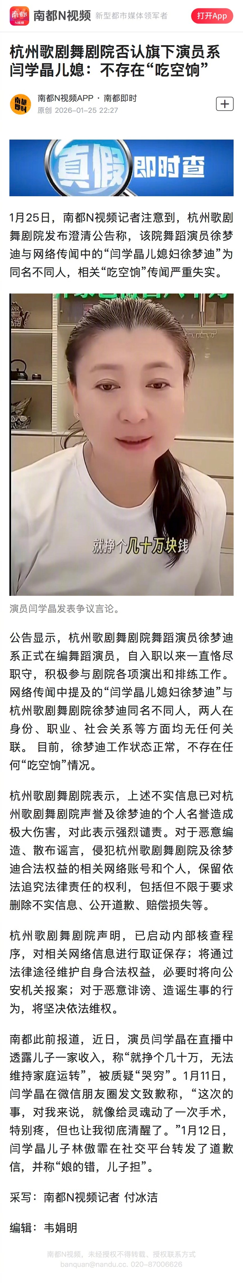 #杭州辟谣演员系闫学晶儿媳吃空饷#【杭州歌剧舞剧院否认旗下演员系闫学晶儿媳:不存在“吃空饷”】1月25日,南都N视频记者注意到,杭州歌剧舞剧院发布澄清公告称,该院舞蹈演员徐梦迪与网络传闻中的“闫学晶儿媳妇徐梦迪”为同名不同人,相关“吃空饷”传闻严重失实。公告显示,杭州歌剧舞剧院舞蹈演员徐梦迪系正式在编舞蹈演员,自入职以来一直恪尽职守,积极参与剧院各项演出和排练工作。网络传闻中提及的“闫学晶儿媳妇徐梦迪”与杭州歌剧舞剧院徐梦迪同名不同人,两人在身份、职业、社会关系等方面均无任何关联。 目前,徐梦迪工作状态正常,不存在任何“吃空饷”情况。杭州歌剧舞剧院表示,上述不实信息已对杭州歌剧舞剧院声誉及徐梦迪的个人名誉造成极大伤害,对此表示强烈谴责。对于恶意编造、散布谣言,侵犯杭州歌剧舞剧院及徐梦迪合法权益的相关网络账号和个人,保留依法追究法律责任的权利,包括但不限于要求删除不实信息、公开道歉、赔偿损失等。 南都N视频记者 付冰洁