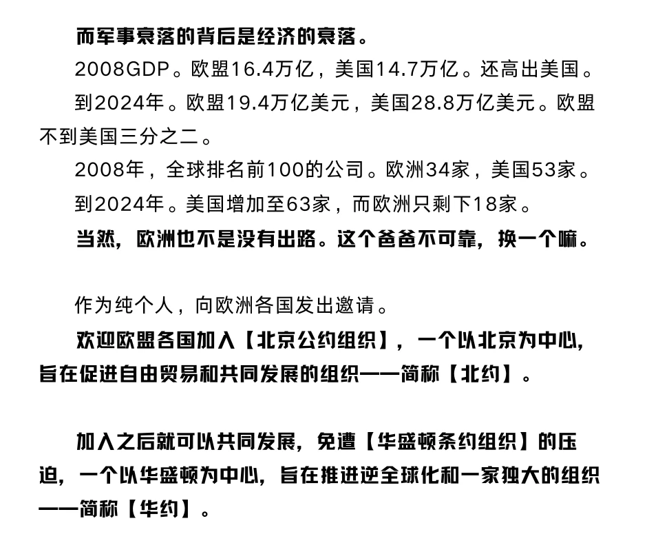 加入之后免遭【华盛顿条约组织】的压迫,一个以华盛顿为中心,旨在推进逆全球化和一家独大的组织,简称【华约】。