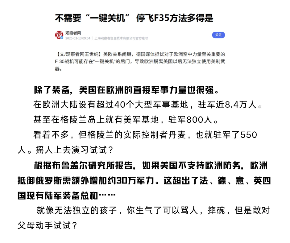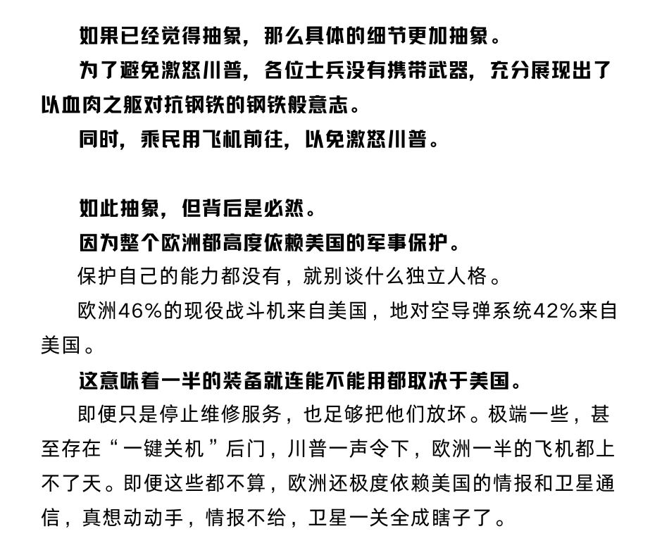 即便只是停止维修,也足够把他们放坏。极端一些,甚至存在“一键关机”,川普一声令下,飞机都上不了天。即便这些都不算,欧洲还极度依赖美国的情报和卫星通信,情报不给,卫星一关全成瞎子了。