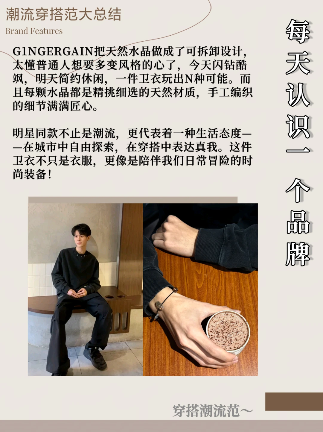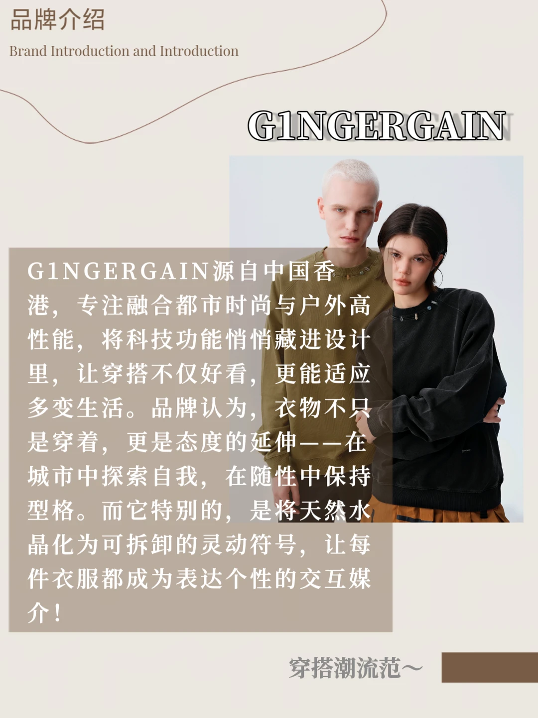 G1NGERGAIN源自中国香港,专注融合都市时尚与户外高性能,将科技功能悄悄藏进设计里,让穿搭不仅好看,更能适应多变生活。品牌认为,衣物不只是穿着,更是态度的延伸——在城市中探索自我,在随性中保持型格。而它特别的,是将天然水晶化为可拆卸的灵动符号,让每件衣服都成为表达个性的交互媒介!