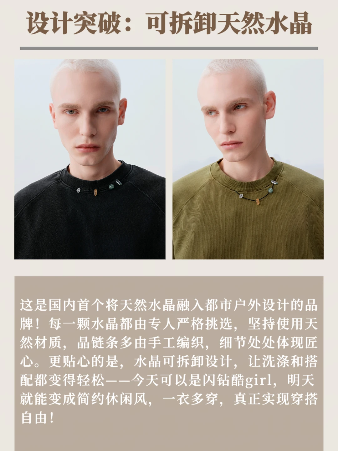 这是国内首个将天然水晶融入都市户外设计的品牌!每一颗水晶都由专人严格挑选,坚持使用天然材质,晶链条多由手工编织,细节处处体现匠心。更贴心的是,水晶可拆卸设计,让洗涤和搭配都变得轻松——今天可以是闪钻酷girl,明天就能变成简约休闲风,一衣多穿,真正实现穿搭自由!
