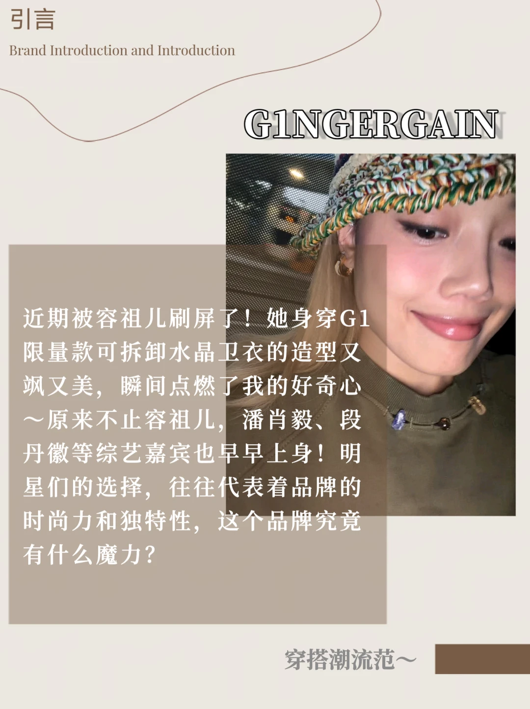 近期被容祖儿刷屏了!她身穿G1限量款可拆卸水晶卫衣的造型又飒又美,瞬间点燃了我的好奇心~原来不止容祖儿,潘肖毅、段丹徽等综艺嘉宾也早早上身!明星们的选择,往往代表着品牌的时尚力和独特性,这个品牌究竟有什么魔力?