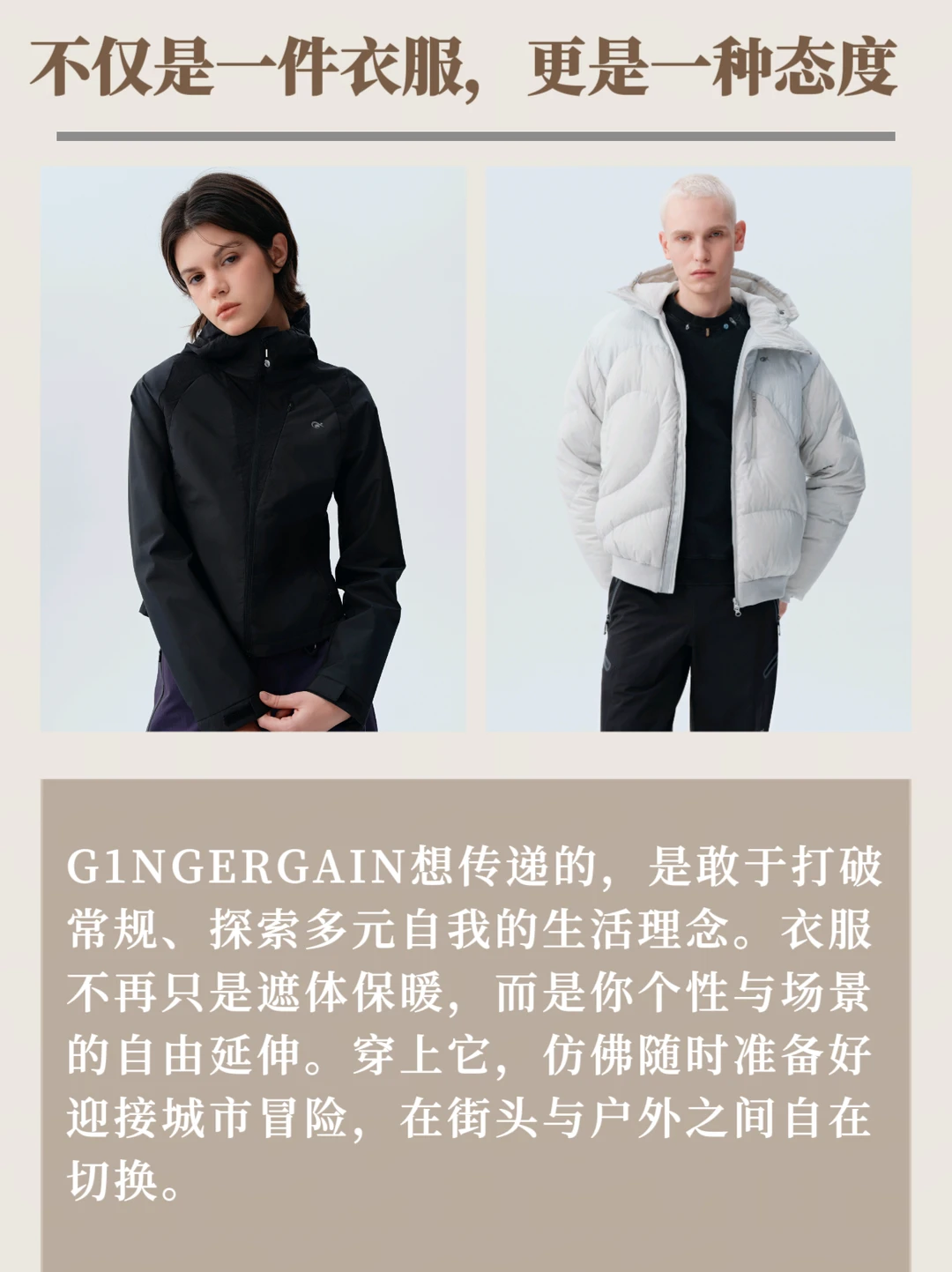 G1NGERGAIN想传递的,是敢于打破常规、探索多元自我的生活理念。衣服不再只是遮体保暖,而是你个性与场景的自由延伸。穿上它,仿佛随时准备好迎接城市冒险,在街头与户外之间自在切换。