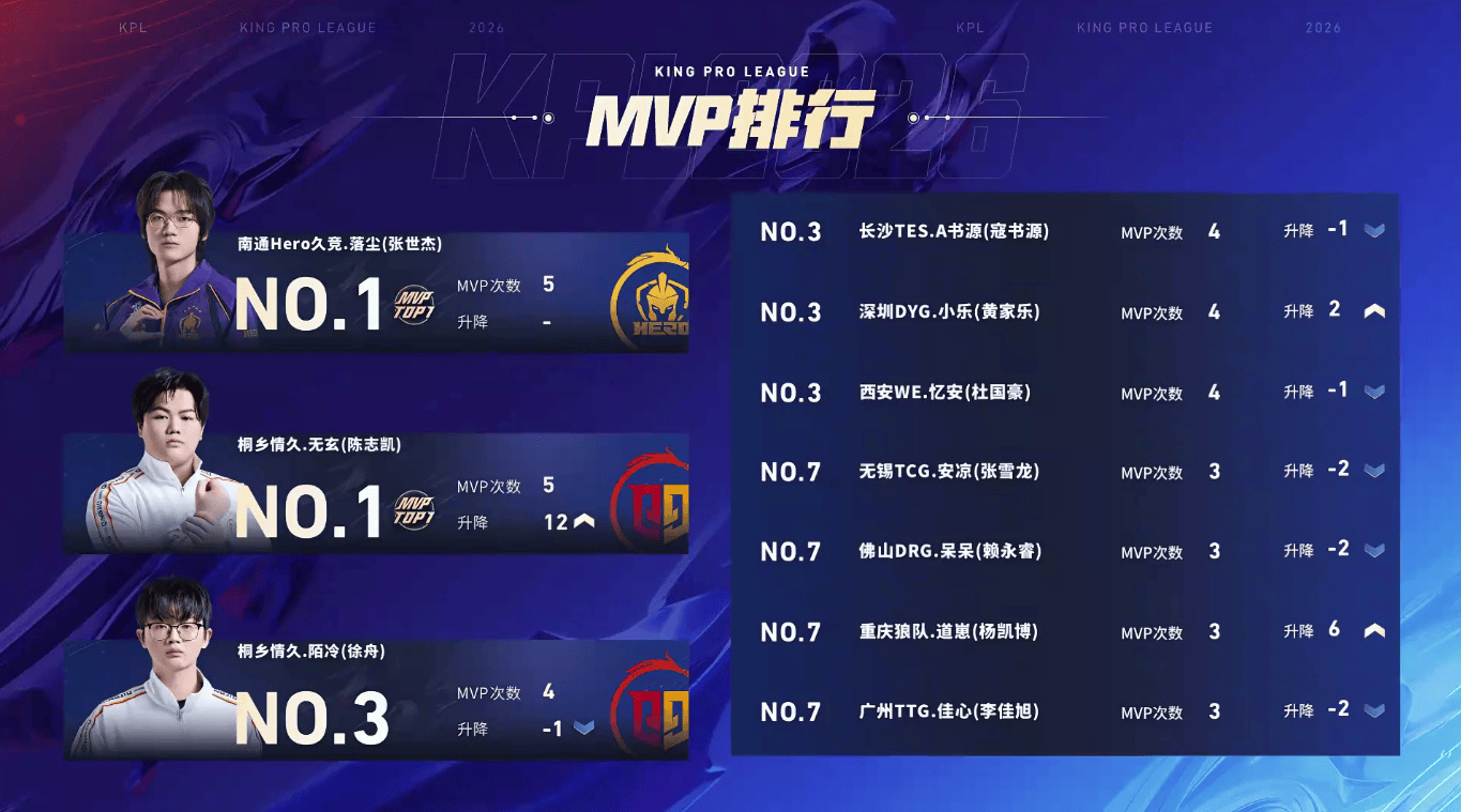 南通Hero久竞_落尘(张世杰)、桐乡情久-无玄(陈志凯)均累计获得5次MVP,并列MVP排行榜首;