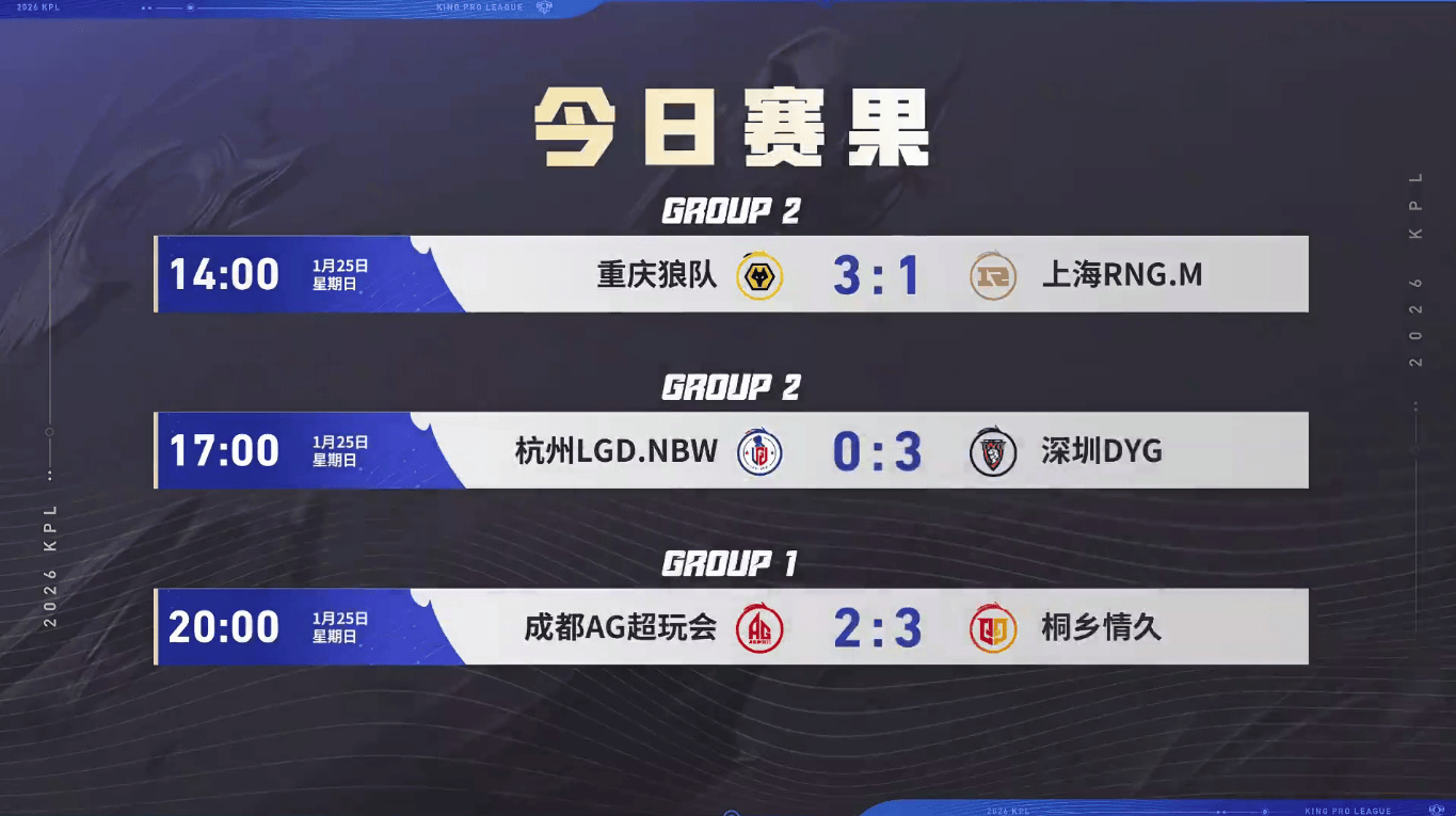 虎扑01月25日讯[赛果]一组情久榜首,AG第四;二组DYG榜首,狼队第二