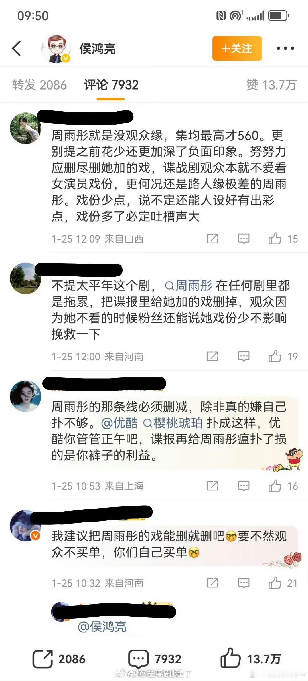 肖战粉丝求删减周雨彤谍报戏份肖战粉丝留言希望减少周雨彤谍报戏份 这没招了,花少6播出后,路人缘直下下滑