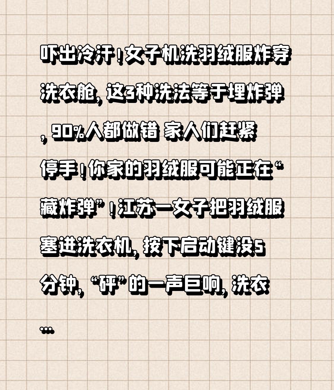 吓出冷汗!女子机洗羽绒服炸穿洗衣舱,这3种洗法等于埋炸弹,90%人都做错 家人们赶紧停手!你家的羽绒服可能正在“藏炸弹”!江苏一女子把羽绒服塞进洗衣机,按下启动键没5分钟,“砰”的一声巨响,洗衣舱门直接被炸开,玻璃碎片溅了一地,幸好当时没人在旁边,否则后果不堪设想!这可不是个例,河南、浙江近一个月就曝出3起羽绒服清洗爆炸案,90%的人都在犯同一个致命错误! 你是不是也这么洗羽绒服?脏了直接丢洗衣机、用热水浸泡、洗完暴晒烘干?恰恰是这些习以为常的操作,正在把安全隐患埋在身边。先说说江苏这起爆炸的真相:女子的羽绒服是含绒量90%的白鸭绒,她用了“强力脱水”模式,高速旋转下,羽绒服里的羽绒膨胀产生巨大气压,而洗衣舱密封过严,压力无处释放,最终直接炸穿舱门——这原理就像给气球充气太满会爆,羽绒服就是个“会膨胀的气囊”! 第一个转折点来了:很多人觉得“羽绒服不能机洗”是谣言,其实错在“洗法”不是“能不能洗”。专业洗衣店老板揭秘:羽绒服能不能机洗,关键看水洗标!如果标着“不可机洗”,强行机洗不仅会炸,还会让羽绒结块、保暖性暴跌;就算能机洗,也绝对不能选“强力洗”“高速脱水”,水温不能超过30℃,更不能和牛仔裤、毛衣等硬材质混洗,摩擦产生的静电+气压膨胀,就是爆炸的“双重导火索”。 更吓人的是这3种“自杀式洗法”,很多人天天在做:一是用热水浸泡超过10分钟,羽绒遇热收缩结块,清洗时更易产生气压;二是洗完直接烘干或暴晒,高温会让羽绒服涂层变硬变脆,膨胀时容易破裂;三是洗前不扣扣子、不拉拉链,蓬松的羽绒会从缝隙挤出,缠绕滚筒引发故障。浙江那起爆炸案,就是因为当事人用60℃热水泡了20分钟,还开了70℃烘干模式,直接把羽绒服变成了“压力炸弹”。 第二个反转:正确洗羽绒服不仅不会炸,还能穿3年不结块、不变形!分享3个安全洗法,都是洗衣店老板私藏的干货:首先看水洗标,能机洗的选“轻柔模式”“低速脱水”,最好在洗衣机里放2-3个干净网球,防止羽绒结块;不能机洗的用冷水+中性洗衣液,手洗时轻轻按压,千万别揉搓拧绞;洗完后平铺阴干,或者用吹风机冷风档吹干,绝对不能暴晒或烘干。 可能有人会说:“我这么洗了好几年都没事啊?” 其实风险就像抽盲盒,一旦遇到这3种情况,爆炸概率瞬间翻倍:含绒量超过80%、羽绒服有防水涂层、洗衣舱容量小于6公斤。专业人士测算,一件含绒量90%的羽绒服,高速脱水时能产生相当于3个大气压的压力,足以炸穿普通洗衣舱的玻璃门。 冬天穿羽绒服图的是保暖,可别因为洗错方法酿成悲剧。想想看,如果你正在厨房做饭,洗衣机突然爆炸;或者孩子在旁边玩耍,玻璃碎片溅到身上,后果真的不敢想。其实正确清洗并不麻烦,多花5分钟看水洗标、选对模式,就能既安心又能延长羽绒服寿命。 你平时是怎么洗羽绒服的?有没有遇到过类似的危险情况?评论区分享你的经验,点赞转发给家人朋友,让更多人避开这些致命误区,别让保暖外套变成“家庭炸弹”!