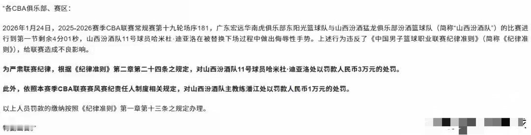 晚上9点!罚单公布!CBA正式宣判:山西两人被罚,迪亚洛最重就在刚刚,CBA官方公布一则罚单,昨晚广东与山西的比赛舆论四起,比赛过程跌宕起伏,而山西两人宣告被处罚,迪亚洛的处罚是最重的!山西队外援迪亚洛因为比赛中挑衅裁判,对着裁判做出数钱动作,并且多次情绪激动对裁判员表达不满,被CBA处罚3万元人民币,被给予公示警告。山西队主帅潘江因为比赛中未能控制迪亚洛情绪,后者在替补席做出违规动作,被连带处罚1万元人民币。两人累计被罚款四万元,并被给予官方警告。你怎么看待CBA官方的这一份罚单?其实对着裁判做出数钱手势,迪亚洛被处罚早就板上钉钉,但是这份宣判让人意外的点可能是,迪亚洛并没有因为这个而被禁赛处罚。明天山西主场面对北京队,没有被禁赛的迪亚洛照常出战,这场也是一场焦点大战。