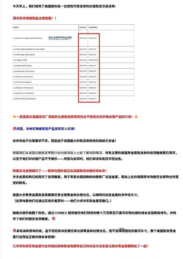 已售罄,但无人出价?美国白银批发市场崩盘![奋斗][奋斗] 2026年刚开头,白银市场就闹出大动静。中国从1月1日起把白银正式列入战略物资清单,出口必须走许可证审批,跟稀土一个级别。这政策一落地,美国那边白银批发渠道直接卡壳。多家跟美国铸币局合作的授权经销商库存系统显示,所有银条、银币、批发大包全标售罄。交易平台上卖单挂不出来,买家出再高价也没人接盘,出现典型的“已售罄但无人出价”局面。 这事根子在供需两头拉扯。全球白银已经连续五年供给缺口,2025年缺口超过1.1亿盎司。矿产量主要靠墨西哥、中国、秘鲁这前三名,合计占全球六成以上。中国产量排第二,精炼产能更是全球大头,过去出口的白银占国际流通量相当大一块。现在审批一收紧,出口量直接腰斩,很多原本流向美国的货卡在关口。美国的工业用银高度依赖进口,2024年进口占比64%,光伏、电动车、电子、电池这些领域每年吞掉海量白银,一旦上游断供,批发市场立马现原形。 美国批发商这几天基本停摆。经销商没法从上游拉货,拉美和欧洲仓库也补不上缺口。交易员只能看着期货价格在高位晃,实物环节却彻底没流动性。有人想卖存货,批发商直接标“no bid”,意思是不收,因为收了也转不出手。整个链条卡死,买家急着囤,卖家惜售,结果就是没人敢报价,市场实质性冻结。这跟纸面价格高低没太大关系,问题是实物交付链断了。 白银现在早就不是过去印象里只用来做首饰和避险的玩意儿。工业需求已经占总需求的55%以上,光伏一项就吃掉三分之一左右,而且还在年年涨。太阳能电池板、电动车电池、5G设备、医疗器械,这些东西都离不开白银的高导电性和导热性。供给端却很难快速跟上,银矿大多是铅锌铜金矿的副产品,主产银矿本来就少,开新矿周期长、成本高、环保要求严。全球矿产高度集中,几个大国捏着产量和储量,中国既有产量又有精炼能力,话语权自然大。 中国这次把白银升格为战略物资,其实是保自己产业安全。中国是全球光伏、电动车、储能、电子制造的最大基地,这些行业未来十几年都是重中之重。白银作为核心原材料,如果不管不顾谁出价高卖给谁,短期赚快钱,长期就是把自家升级所需的资源提前拱手让人。历史上中国吃过白银被外部卡脖子的亏,明清时期税收和货币绑在海外银流上,一旦供给波动,整个财政和社会就跟着晃。现在重演类似逻辑,只不过方向反过来:与其让别人卡自己,不如先把资源攥在手里。 美国这边也不闲着,2025年就把白银加进关键矿产清单,因为电路、电池、太阳能板、军工设备都离不开它。买方升级清单,卖方升级管制,两边都在抢产业链控制权。这不是谁打谁的热战,而是资源和产业命脉的拉锯。白银价格这两年涨得凶,2025年全年翻了1.6倍多,一度冲到80美元以上,现在批发市场一断,纸价再高也没用,实物才是硬道理。 回看历史,1980年亨特兄弟那次白银挤仓也闹得轰轰烈烈。他们大量囤积实物和合约,把价格从6美元拉到50美元,结果监管一出手,保证金要求一加,融资链断裂,价格几天崩盘,三分之一市值没了。兄弟俩最后破产,欠债一堆,官司打了好几年。这次美国批发市场崩盘规模没那么夸张,但暴露的问题差不多:过度依赖单一来源,政策一变就现死穴。实物基础一晃,整个市场信心就没了。 现在白银还在高位震荡,工业端消化库存,投资端观望。谁也说不准接下来是继续缺货推高价格,还是需求放缓回调。但有一点清楚:白银已经从边缘商品变成电气化和新能源时代绕不开的战略原料。管制也好,进口依赖也好,都是大国在为未来十年二十年布局。批发市场这次“售罄却没人出价”,就是现实给所有人上的一课——纸面再热闹,实物断供才是真要命。