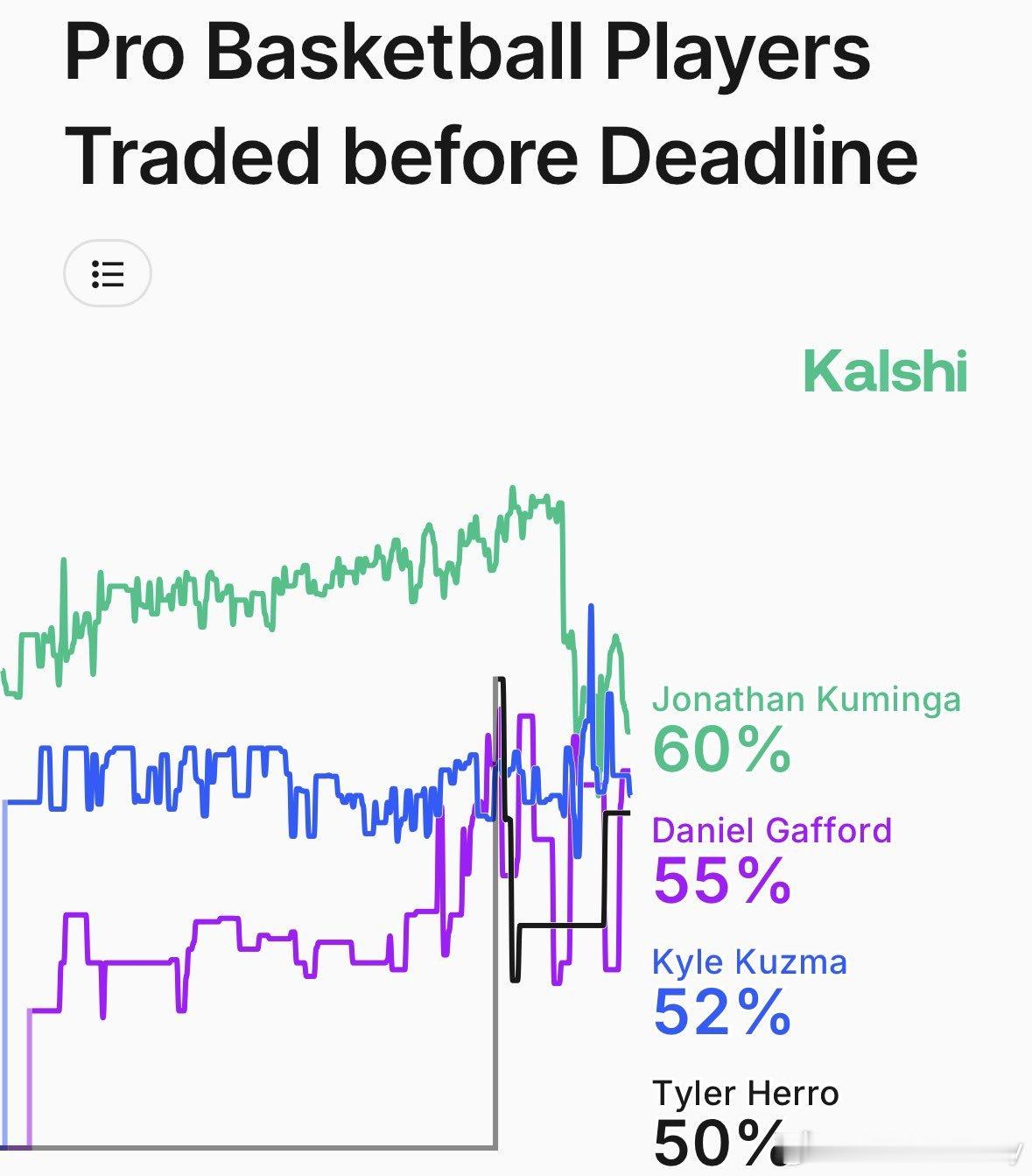 Kalshi Sports更新:交易截止日期前最有可能被交易球员赔率:乔纳森·库明加:60%丹尼尔·加福德:55%凯尔·库兹马:52%泰勒·希罗:50%