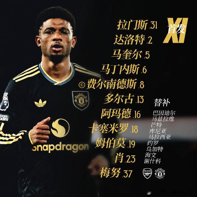 焦点战!阿森纳vs曼联 首发阵容⬇️ 00:30开赛!阿森纳首发:1-拉亚、12-廷贝尔、2-萨利巴、6-加布里埃尔、5-因卡皮耶、41-赖斯、36-苏比门迪、8-厄德高、7-萨卡、19-特罗萨德、9-热苏斯曼联首发:31-拉门斯、2-达洛特、5-马奎尔、6-利马、23-卢克·肖、18-卡塞米罗、37-梅努、13-多尔古、8-B费、16-阿玛德、19-姆伯莫英超联赛