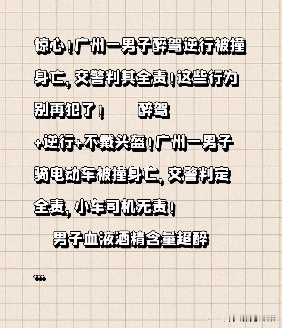 惊心!广州一男子醉驾逆行被撞身亡,交警判其全责!这些行为别再犯了! 醉驾+逆行+不戴头盔!广州一男子骑电动车被撞身亡,交警判定全责,小车司机无责! 男子血液酒精含量超醉驾标准,在机动车道逆行,且未佩戴头盔,与正常驶出隧道的小车猛烈相撞,当场死亡。交警认定其多项违规操作是事故主因,承担全部责任。血的教训警示:安全无小事,规则要牢记! 生命不能重来!转发提醒身边人,骑电动车务必远离酒驾、逆行、不戴头盔!觉得有用就点赞收藏! 交通事故定责 广州电动车处罚 醉驾撞人致死
