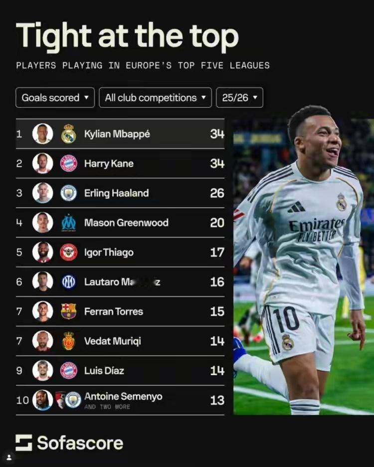 体育在本轮西甲,皇马2-0击败比利亚雷亚尔,姆巴佩梅开二度。以下为五大联赛球员在本赛季各项赛事总进球榜,姆巴佩与凯恩均打进34球,具体如下:1、姆巴佩(皇马) 34球2、凯恩(拜仁)34球3、哈兰德(曼城)26球4、格林伍德(马赛)20球5、伊戈尔·蒂亚戈(布伦特福德)17球6、劳塔罗(国米)16球7、费兰(巴萨)15球8、穆里奇(马洛卡)14球9、迪亚斯(拜仁)14球10、塞梅尼奥(曼城)13球