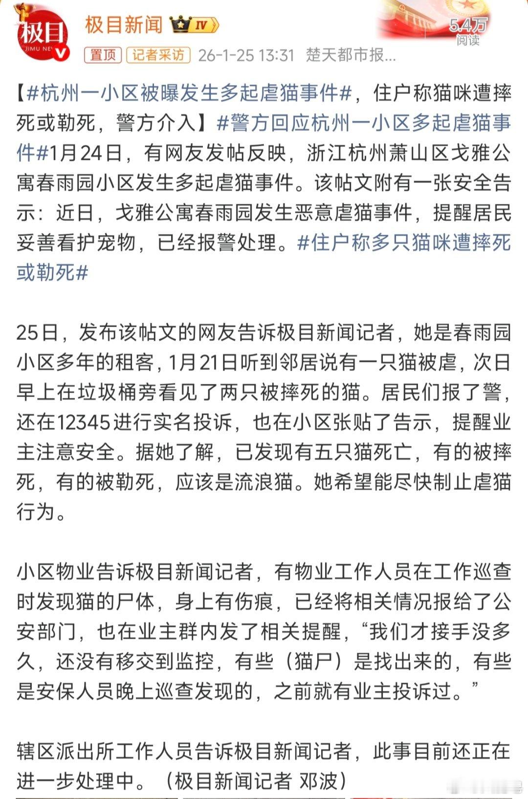 杭州一小区被曝发生多起虐猫事件 你可以不喜欢猫,可以不喜欢狗,但是没必要去虐猫虐狗。你是人,不是畜生。另外,不知道是不是我的刻板印象,感觉虐猫虐狗的这些人多少是有些心理问题。如果虐人也不违法,估计这群人要虐人了吧。
