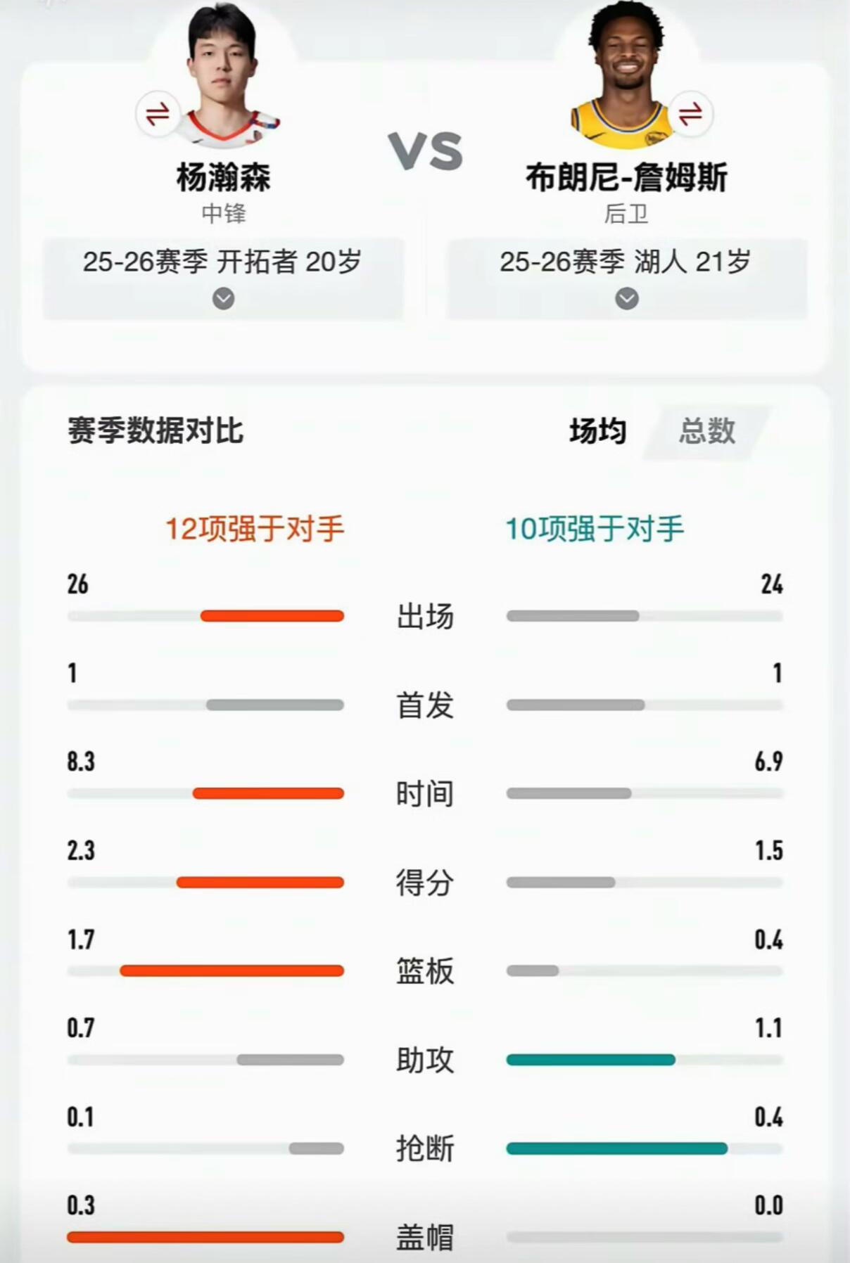 一年级的杨瀚森与二年级的布朗尼,数据差不多。詹姆斯退役了,不知道布朗尼还有没有球打?