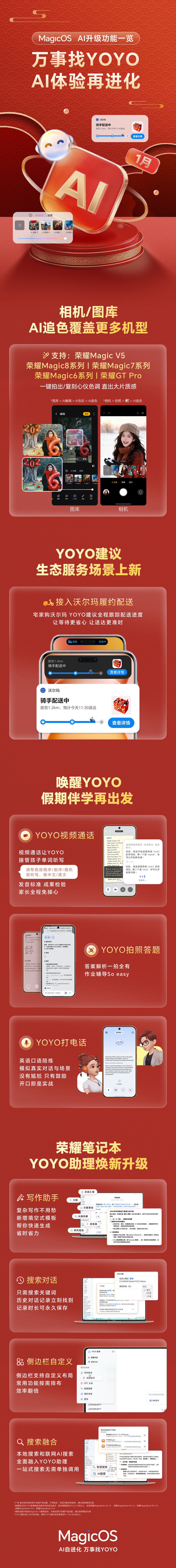 MagicOS 1月月更带着满满的诚意,AI功能一路“开挂”进化!AI追色功能,老手机也能秒变“美图大师”,看到电影里绝美的色调,或者小红书上超火的氛围感美图,一键就能复刻,轻松拍出大片质感,春节假期拍照直接赢麻了!还有YOYO视频通话,和远方家人面对面聊天,感觉距离一下子就拉近了。MagicOS真的太懂我们了~MagicOS月月新