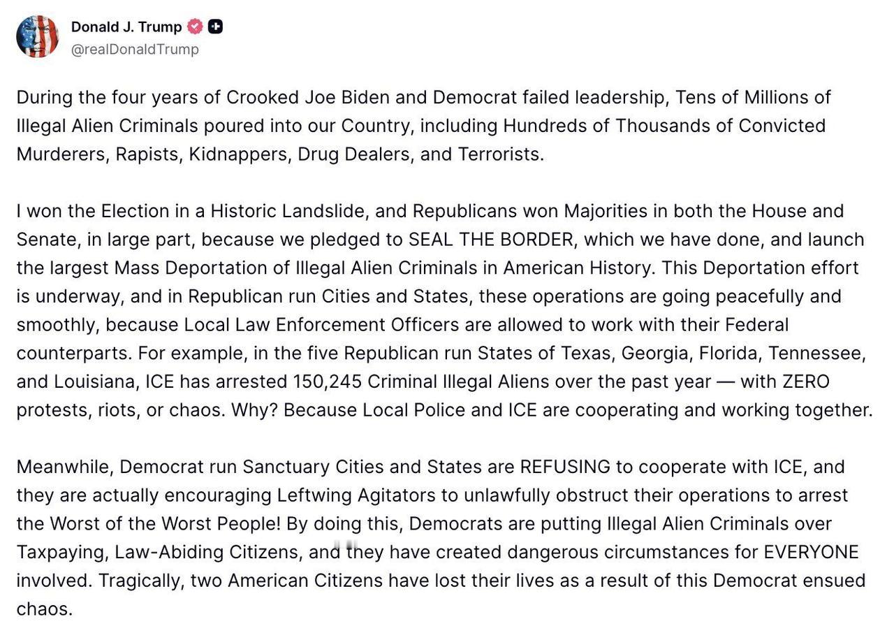 🚨最新消息——特朗普总统说:“我以历史性的压倒性优势赢得了大选……在德克萨斯州、佐治亚州、佛罗里达州、田纳西州和路易斯安那州这五个共和党执政的州,美国移民及海关执法局(ICE)在过去一年里逮捕了150,245名非法移民罪犯——期间没有发生任何抗议、骚乱或混乱。为什么?” “因为地方警察和ICE一直在合作,共同努力。” “与此同时,民主党执政的庇护城市和州拒绝与美国移民及海关执法局(ICE)合作,他们实际上还在鼓励左翼煽动者非法阻挠ICE逮捕最穷凶极恶之徒的行动!民主党人这样做,是将非法移民罪犯置于纳税守法公民之上,并给所有相关人员都造成了危险的局面。令人痛心的是,两名美国公民因此丧生。”🚨 JUST IN — PRESIDENT TRUMP SAYS IT PERFECTLY: "I won the Election in a Historic Landslide...in the five Republican run States of Texas, Georgia, Florida, Tennessee, and Louisiana, ICE has arrested 150,245 Criminal Illegal Aliens over the past year — with ZERO protests, riots, or chaos. Why?" "Because Local Police and ICE are cooperating and working together." "Meanwhile, Democrat run Sanctuary Cities and States are REFUSING to cooperate with ICE, and they are actually encouraging Leftwing Agitators to unlawfully obstruct their operations to arrest the Worst of the Worst People! By doing this, Democrats are putting Illegal Alien Criminals over Taxpaying, Law-Abiding Citizens, and they have created dangerous circumstances for EVERYONE involved. Tragically, two American Citizens have lost their lives as a result of this Democrat ensued chaos."