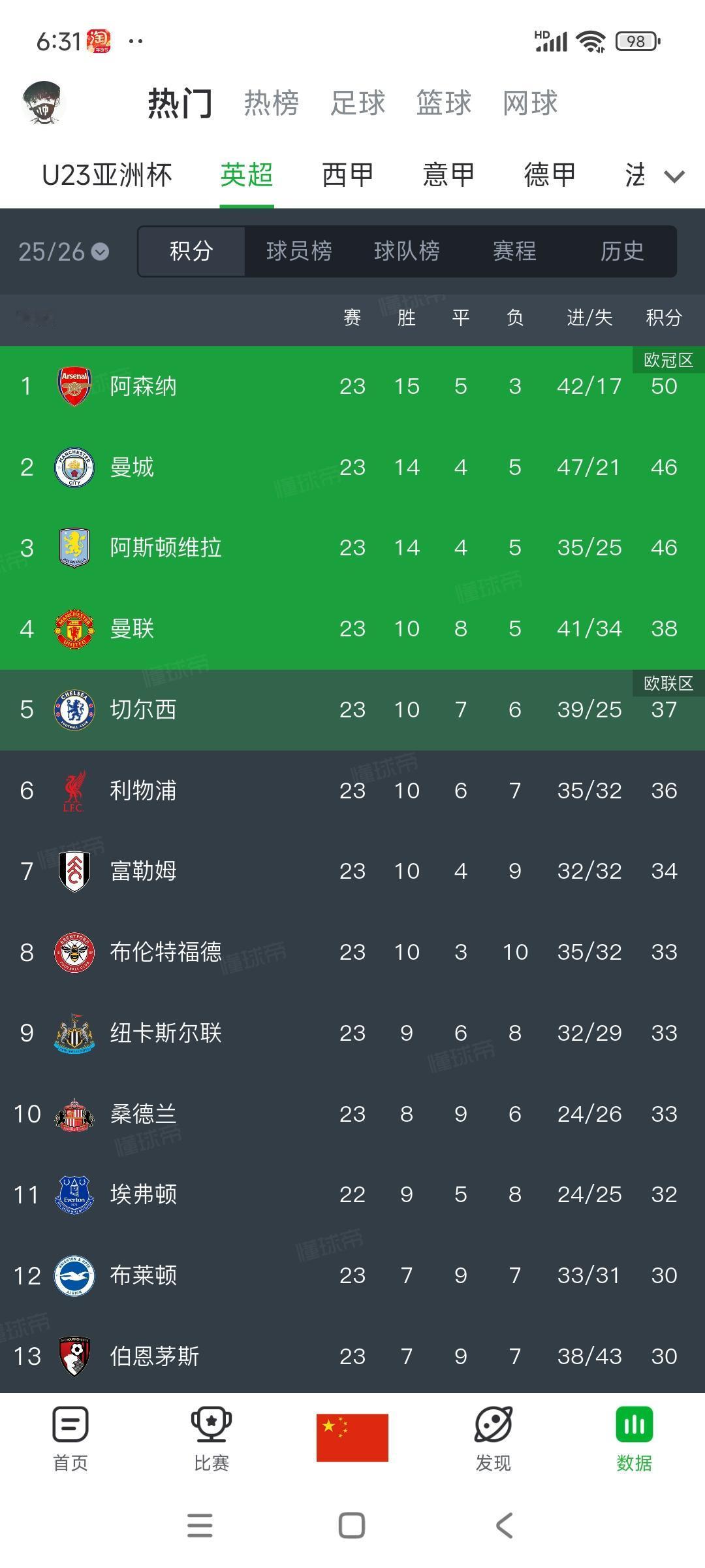 英超最新积分榜,现在是群龙混杂,主要是曼联换帅连斩榜首两强。 1阿森纳50分,只领先4分啦,阿森纳球迷瑟瑟发抖害怕丢冠。 2曼城46分,近期不太稳也担心。 3维拉46分,放好心态,第三名够了。 4曼联38分,换帅后终于发挥真正实力,阿莫林真是拖累球队。 5切尔西37分,不太稳定的球队。 6利物浦36分,可能也要换帅。 最后提一下热刺,跟上赛季一样英超保级,欧战成绩非常好呢。[可怜][大金牙]